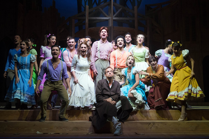 Peccato per l’ assenza della musica dal vivo in teatro cosi come prevederebbe tale edizione, sicuramente solo per motivi di spazio, ma lo spettacolo è ugualmente emozionante, le canzoni, conosciutissime dal pubblico presente, intepretate in maniera magistrale non solo da Gianluca Guidi che ha un timbro vocale uguale all’indimenticabile Dorelli, ma anche da tutti gli altri cantanti/attori e ballerini della commedia, 17 giovani talenti che hanno il musical nelle loro corde affiancati da un simpaticissimo Marco Simeoli nel ruolo “cattivo” del Sindaco (nella precedente edizione era stato Toto) e che interpreta benissimo pur avendo come modello di confronto attori bravissimi come Paolo Panelli e Carlo Croccolo nelle edizioni storiche, Emy Bergamo (alla terza partecipazione in commedie di Garinei e Giovannini dopo “Rugantino” e “Se il tempo fosse un gambero”) un’esplosiva quanto sensuale Consolazione, la “donnina allegra” che arriva nel paese per “distrarre” gli uomini ma che finisce per incontrare e innamorarsi, ugualmente ricambiata, il bonaccione del paese, un po’ ignorante un po’ burino, Toto (interpretato magistralmente da Piero Di Blasio) per niente interessato alle donne e al sesso, ma che quando incontra Consolazione si scatena ritrovando il mai assaporato “vigore” e la conquista con le sue arti amatorie e il suo amore per lei, chiedendole di sposarlo per poter salire sull’Arca insieme a lui e a tutti gli altri, la moglie del Sindaco Ortensia (Francesca Nunzi) che non riesce a convincere il marito a non denunciare il parroco alle Autorità per l’Arca che devono costruire né a fermarlo nella sua fuga, e la loro figlia Clementina (Beatrice Arnera) che innamoratissima del parroco si inventa qualsiasi cosa pur di stargli vicino con la speranza che anche lui si innamori di lei.