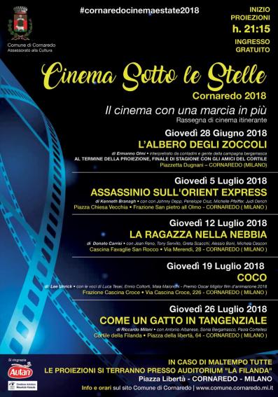 MILANO, giugno 2018 – Al via giovedì 28 giugno “Cinema sotto le stelle Cornaredo 2018”, rassegna cinematografica itinerante ideata e organizzata dall’Assessorato alla Cultura del Comune di Cornaredo con la consulenza artistica e tecnica di Maurizio Casula, i quali propendono, attraverso il progetto, a fornire un’unica esperienza di fruizione di alcune pellicole passate alla storia del cinema, proiettandole in luoghi originali per avvicinare un pubblico eterogeneo per gusti ed età.
