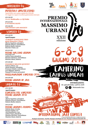 Si è svolto a Camerino l’8 e il 9 giugno 2018 la xxII edizione del Premio Internazionale Massimo Urbani ,il più importante concorso per solisti jazz italiano.E’ stato istituito da Paolo Piangiarelli,produttore della casa discografica “Philology”ed è intitolato a Massimo Urbani geniale sassofonista romano prematuramente scomparso .Il Premio ha l’obiettivo di valorizzare i giovani jazzisti emergenti ,contribuendo allo sviluppo della loro carriera artistica. Dopo il terremoto del 2016 l’organizzazione ha pensato che fosse stato importante “portare in giro per l’Italia il Premio Massimo Urbani”anche con l’obiettivo di accendere un riflettore sulle terre martoriate. Così ad aprile a Torino e a Roma si sono svolte le semifinali dove si sono messi in luce 10 talentuosi giovani.: