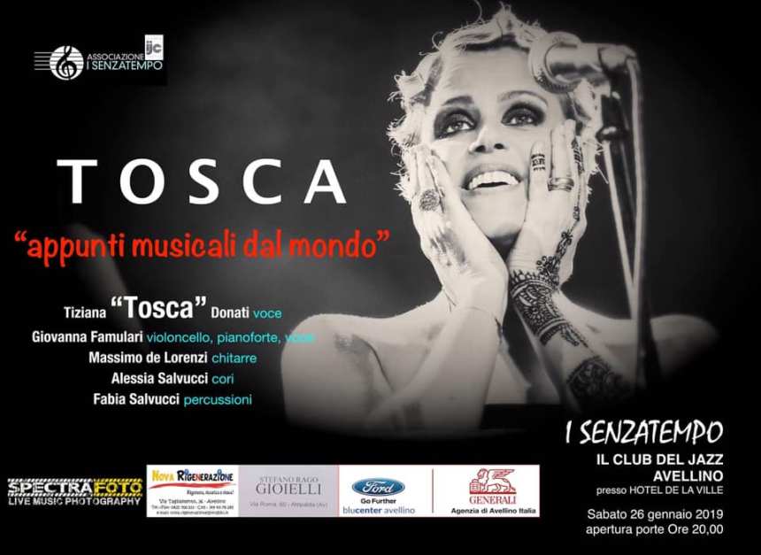 Il 26 gennaio tornano i grandi eventi targati Senzatempo, ed in ossequio ad una precisa vocazione dell’associazione avellinese ed alla idea che ha caratterizzato le scelte della direzione artistica per questa stagione musicale, si continua nella direzione di andare oltre i confini, i porti chiusi, i limiti culturali e mentali, con un progetto di grande respiro. Arriva sul Palco con i suoi Appunti musicali dal mondo, Tiziana “Tosca” Donati. Il suo è un vero e proprio viaggio musicale in giro per il mondo,nato dalla collaborazioni con artisti nazionali ed internazionali e con l’uso di venti lingue differenti. Un atto di coraggio e di speranza, un modo per cantare al mondo intero che non esistono distanze e differenze che non siano un arricchimento per tutti gli esseri umani. Cantante e attrice eclettica, da sempre affascinata dalle musiche popolari del mondo, Tosca ha fatto sue quelle radici sonore che ogni cultura da lei approcciata ha saputo donarle.