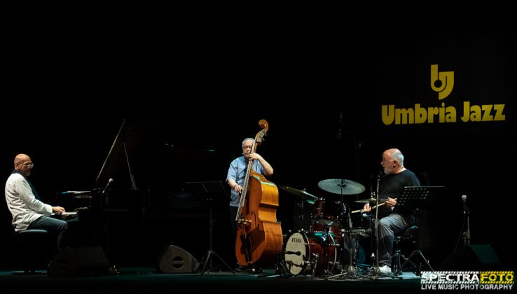 Il secondo concerto, in scena al Teatro Morlacchi è quello di un Trio formidabile composto da autentici maestri come Peter Erskine ai tamburi, Eddie Gomez al contrabbasso e Dado Moroni al pianoforte per suonare jazz allo stato puro. La carriera dei due maestre americani è formidabile, vantando collaborazioni strepitose basta ricordarne una su tutte che Erskine è stato il batterista dei Weather Report e Gomez il contrabbassista del trio di Bill Evans. Dado Moroni, pianista eccezionale ha collaborato tra i più grandi jazzisti del mondo come Ron Carter, Chet Baker, Dizzy Gillespie, Kenny Barron solo per citarne alcuni oltre a partecipare ad un disco formidabile che Ray Brown ha dedicato a cinque pianisti del mondo contemporaneo del jazz e uno di questi cinque, unico non americano, era appunto Dado Moroni. Anche lui è stato protagonista di una delle jam session serali più apprezzate nel corso dell’intero Festival.