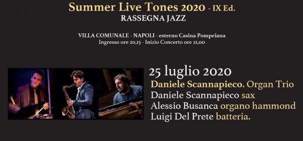 Sabato 25 luglio, negli spazi esterni alla Casina Pompeiana sita in Villa Comunale di Napoli, il secondo appuntamento della IX Edizione della Summer Live Tones 2020 sotto la Direzione artistica di Alberto Bruno, nell’ambito della rassegna “ART’erie”, progetto organizzato da Ravello Creative Lab Srl con la quale collabora il Live Tones per la sezione jazz, con il concerto di Daniele Scannapieco “Organ Trio” con Daniele Scannapieco – Sax Tenore, Alessio Busanca – Hammond, Luigi Del Prete – Batteria.