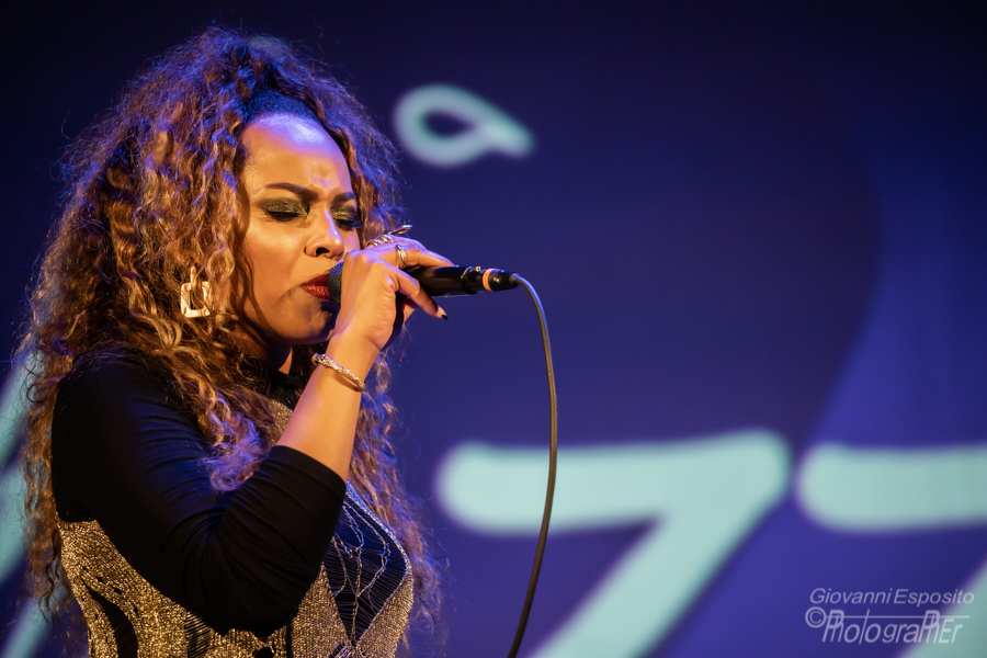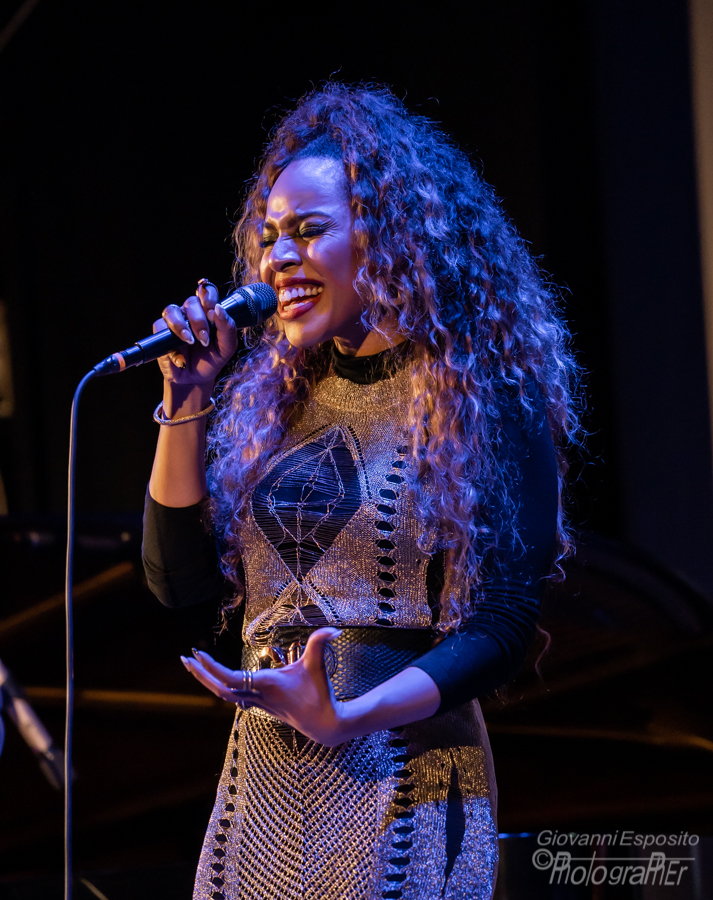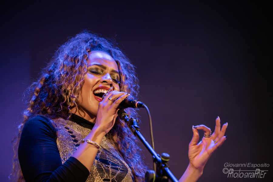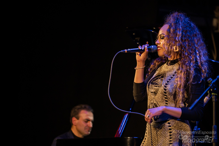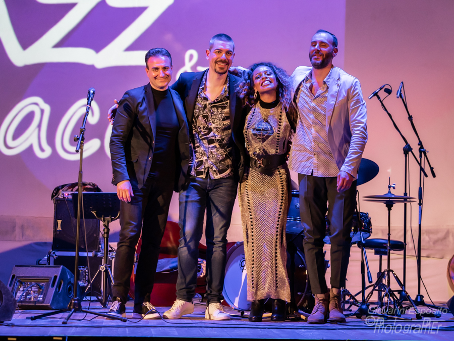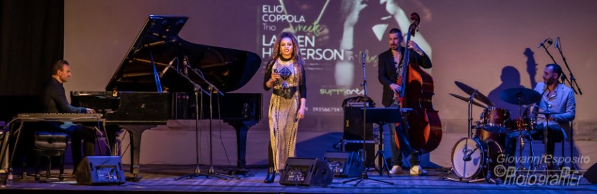 Subito dopo è arrivata sul palco del Teatro Summarte la splendida Lauren Henderson, elegantissima nel suo abito lungo oro e nero, che con il Trio ha presentato al pubblico alcuni dei brani standard jazz riarrangiati con grande talento e interpretati dall’affascinante voce di Lauren come “At last long love” , “Ahora”, “Forget me”, Il meraviglioso “The look of love” grande successo della meravigliosa Diana Krall, “Riptide”, “Perfidia” di Nat King Cole, per chiudere con “Besame mucho” che ha emozionato il numerosissimo pubblico presente e al quale la stessa artista ha dedicato una splendida versione di “What you want do for love”.