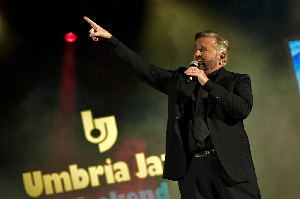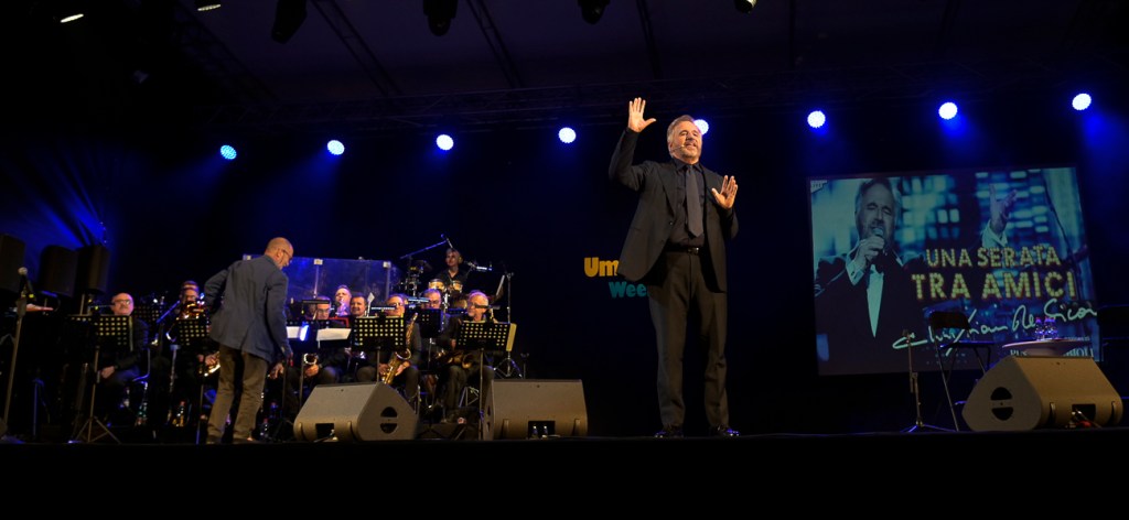 Divertente, ironico e autoironico (“all’inizio dello spettacolo si prende in giro da solo sulla sua forma fisica dicendo ero ancora più grasso, ho perso 7 kg grazie al grande Messeguè che in solo sette giorni è riuscito a fare un vero e proprio miracolo!”) ha iniziato la serata salendo sul palco dal fondo della sala dell’Anfiteatro, salutando il pubblico con grandi sorrisi e sincere strette di mani, e ringraziando più volte, durante lo spettacolo, Carlo Pagnotta e tutto lo staff organizzativo di Umbria Jazz per averlo voluto fortemente sul palco di tale edizione, che per lui, amante del jazz da quando era giovanissimo e che ha iniziato a cantare proprio con le canzoni di miti come Frank Sinatra e tanti altri grandissimi artisti del jazz americano, è la realizzazione di un vero e proprio sogno anche se nella sua carriera di artista ha avuto e ha ancora una carriera straordinaria come attore, regista, cantante e showman.