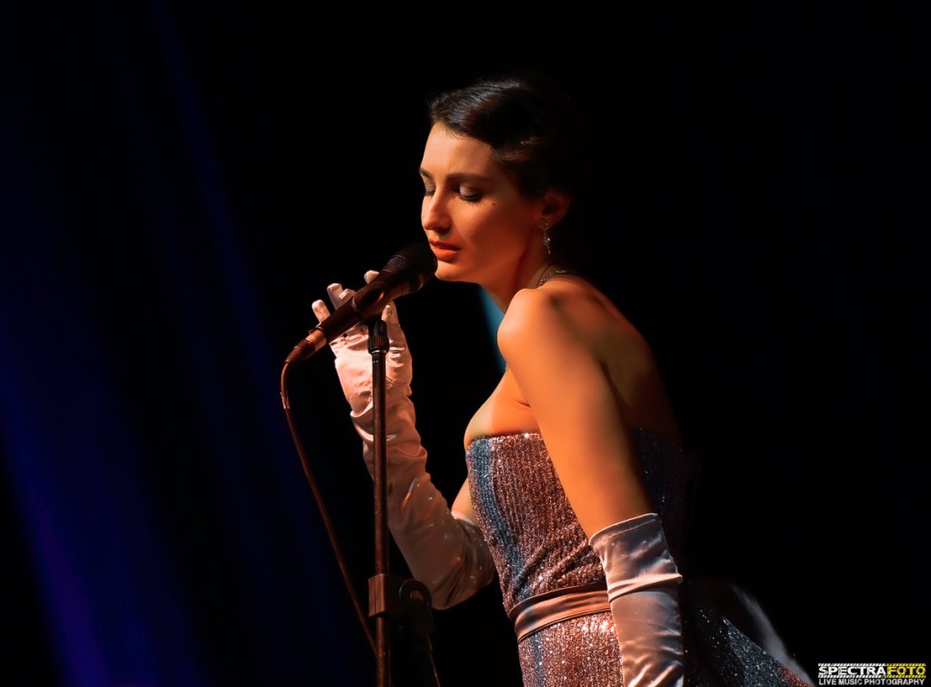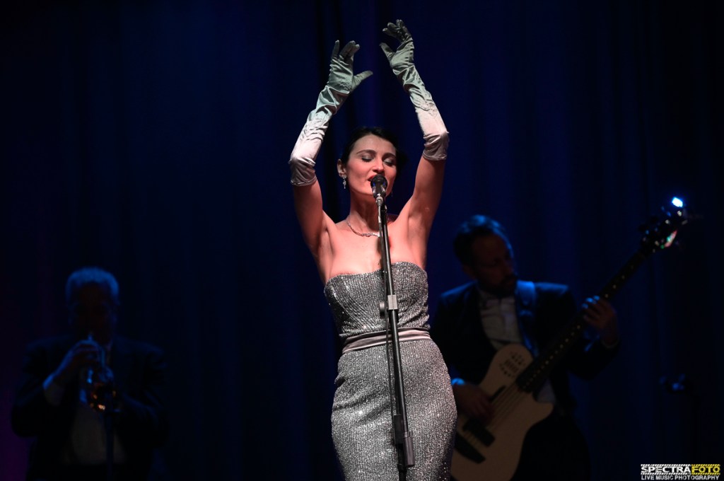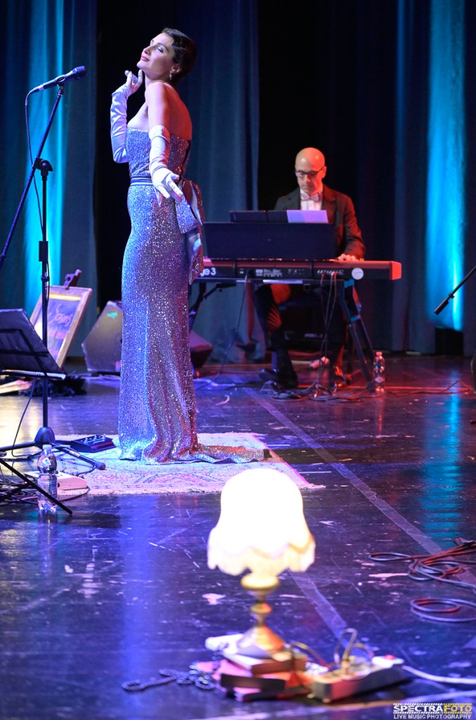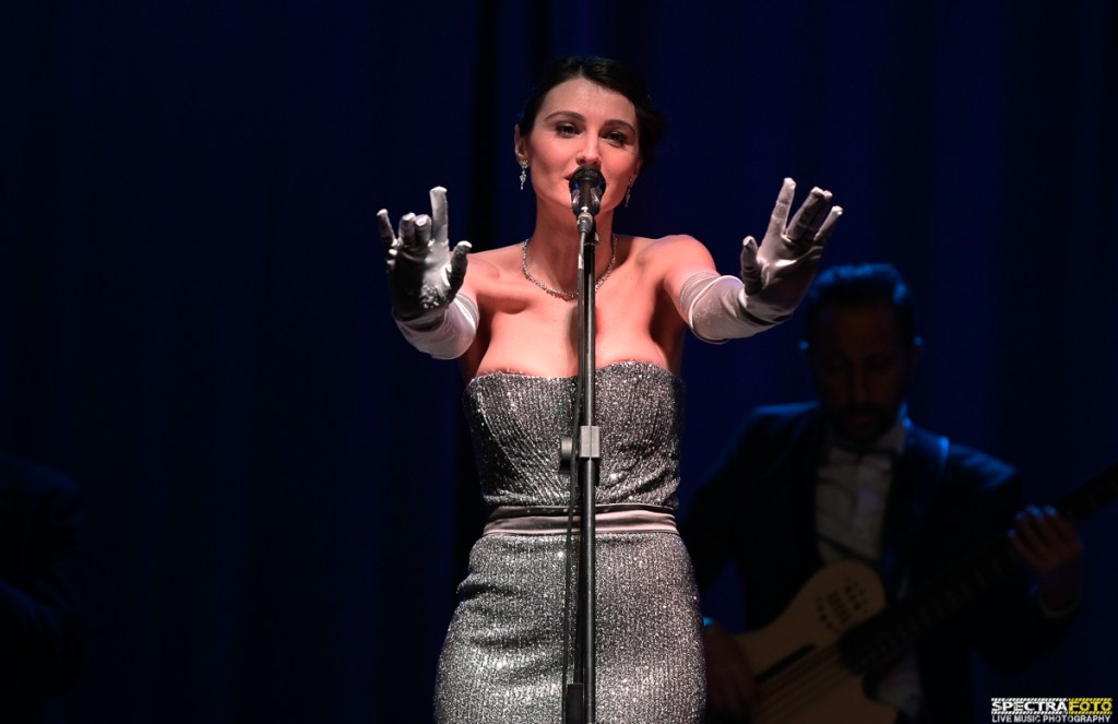 Dopo la presentazione di Alberto Bruno, la band si è presentata sul palco del Teatro del Mav di Ercolano in elegantissimi completi scuri, circondati da una scenografia in pieno stile anni ’50, fatta di quadri, lampade e altri oggetti di arredamento tipici di tale epoca, accogliendo subito con un ritmo strepitoso la front woman del gruppo, la frizzantissima Daniela Tenerini, elegantissima nel suo vestito lungo color argento, pettinata e truccata come una diva del cinema di quegli anni.