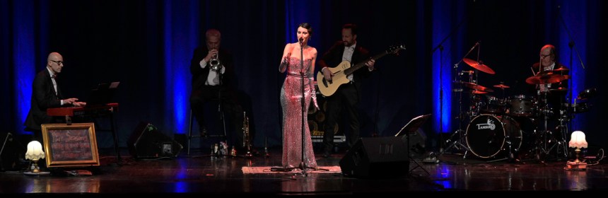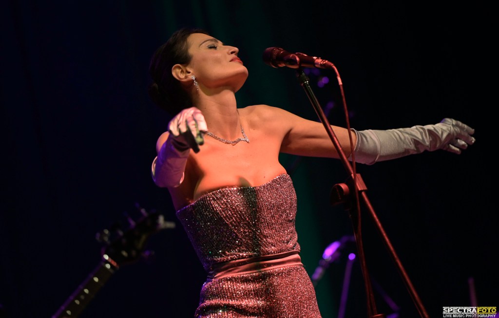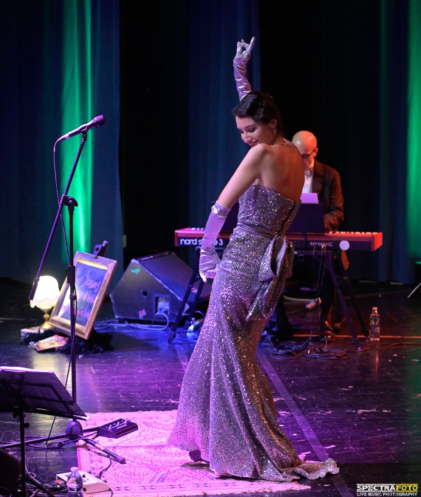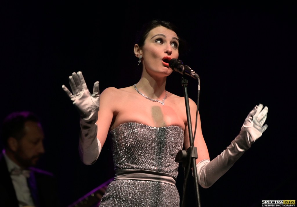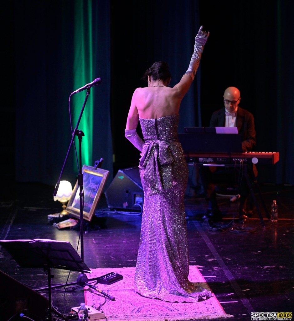 Dopo la presentazione di Alberto Bruno, la band si è presentata sul palco del Teatro del Mav di Ercolano in elegantissimi completi scuri, circondati da una scenografia in pieno stile anni ’50, fatta di quadri, lampade e altri oggetti di arredamento tipici di tale epoca, accogliendo subito con un ritmo strepitoso la front woman del gruppo, la frizzantissima Daniela Tenerini, elegantissima nel suo vestito lungo color argento, pettinata e truccata come una diva del cinema di quegli anni.