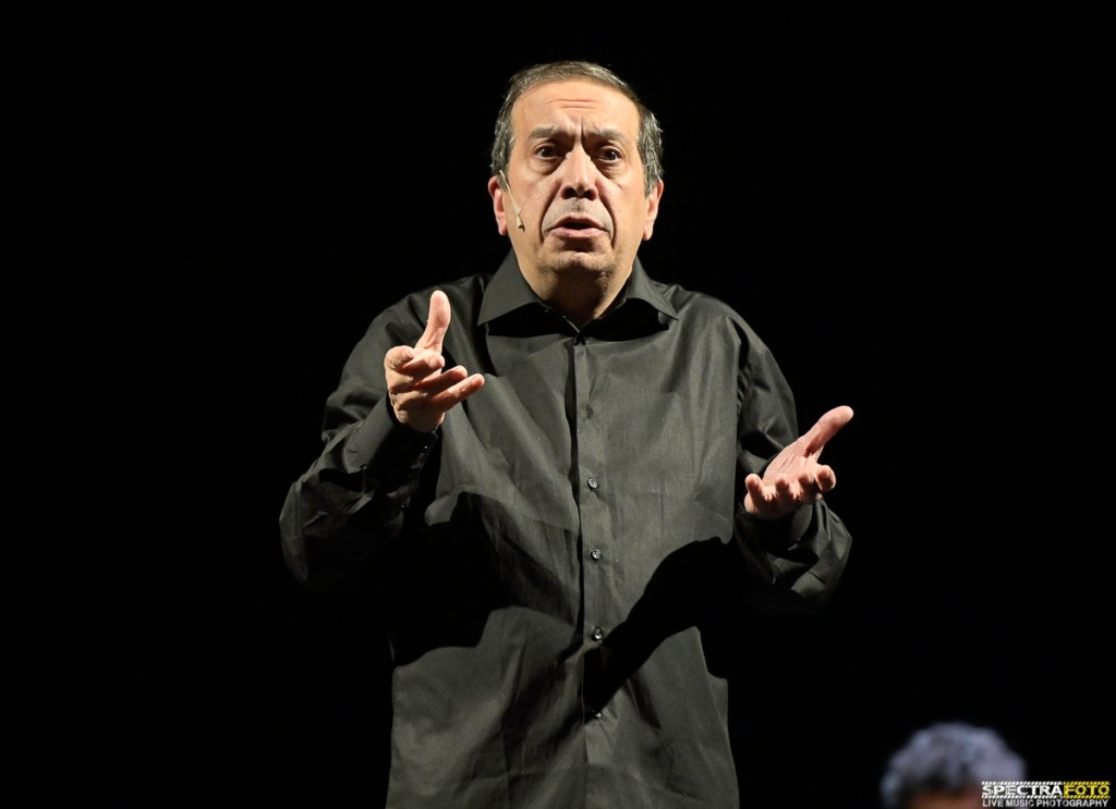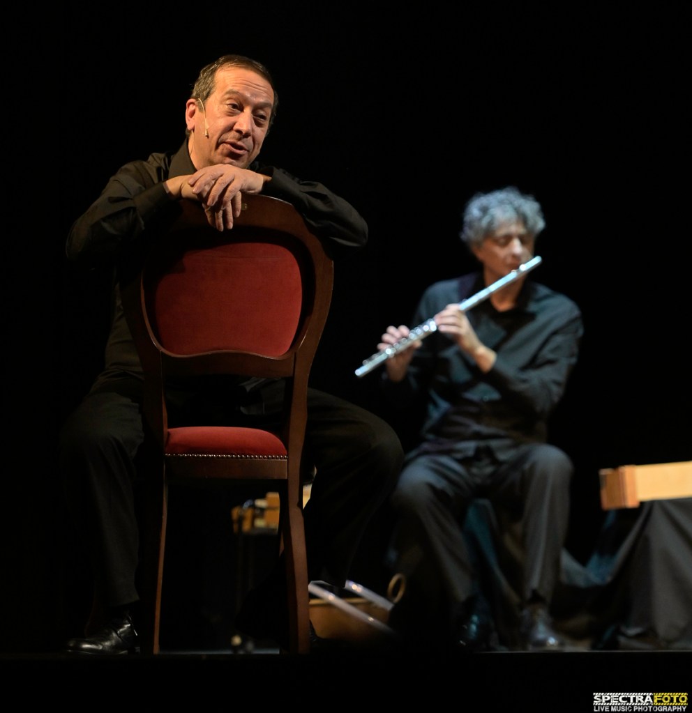 Fa pensare come la bravura e il talento indiscusso di Roberto del Gaudio si esprime in tanti momenti dello spettacolo stesso in maniera sublime come quello di unire il testo di una delle canzoni più divertenti del repertorio dello stesso Vittorio Marsiglia “Canzone Pettegola” che in questa occasione viene cantata su di una sedia con lo schienale al contrario perché ad un certo punto diventa il mezzo per poter inserire il monologo del “professore” di Eduardo De Filippo, scena clou di “Questi fantasmi”, che poi diventa un monologo sulla Napoli invasa dai turisti che anziché’ godere delle bellezze artistiche della città non fanno altro che camminare e mangiare, mangiare e camminare sempre per la stessa strada, rendendo il centro storico un unico grande fast food all’aperto (pensiero condiviso da tantissimi tra il pubblico visto l’applauso che ne scaturisce al racconto) .