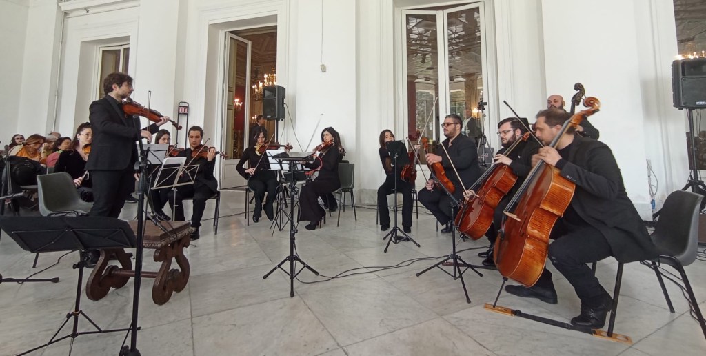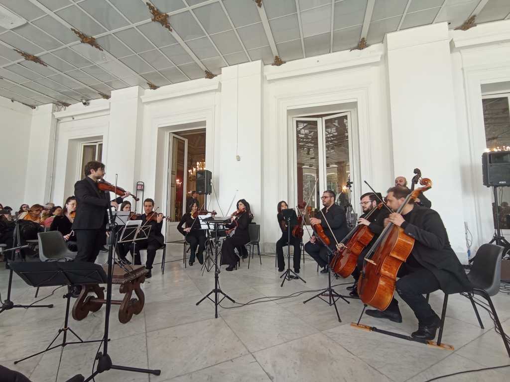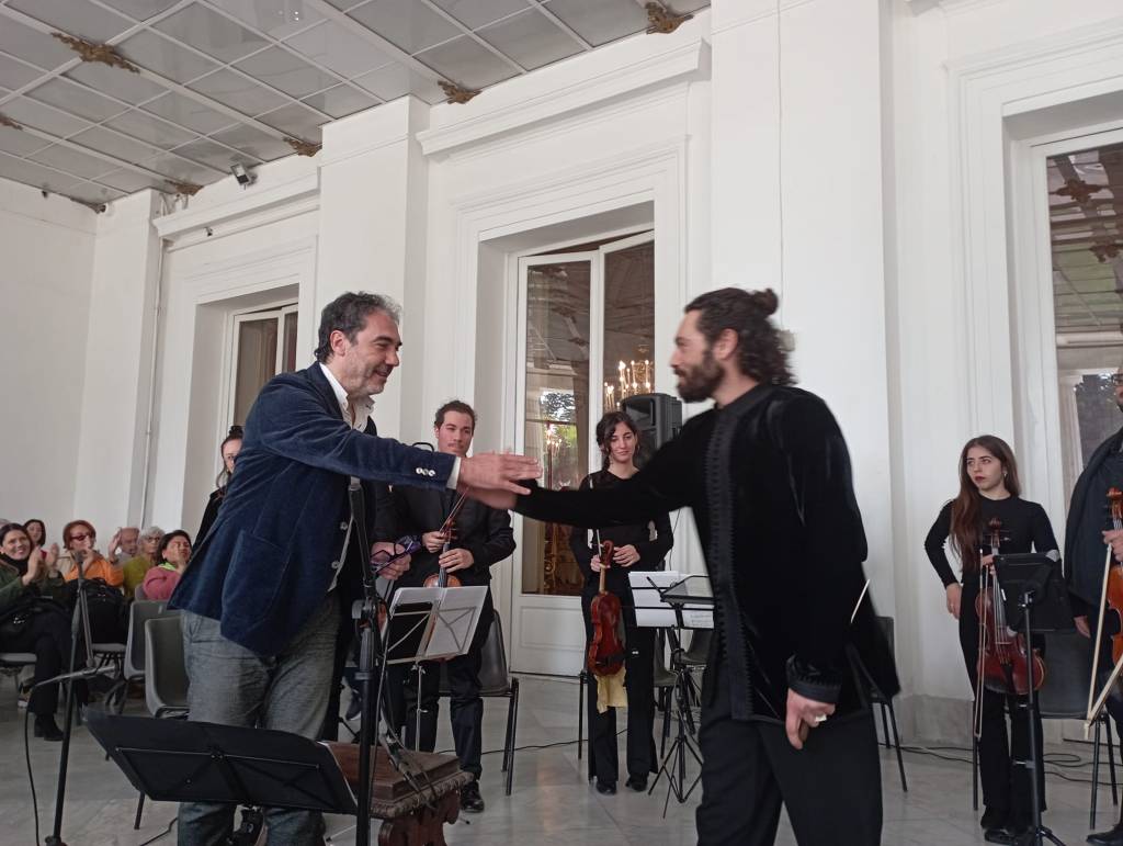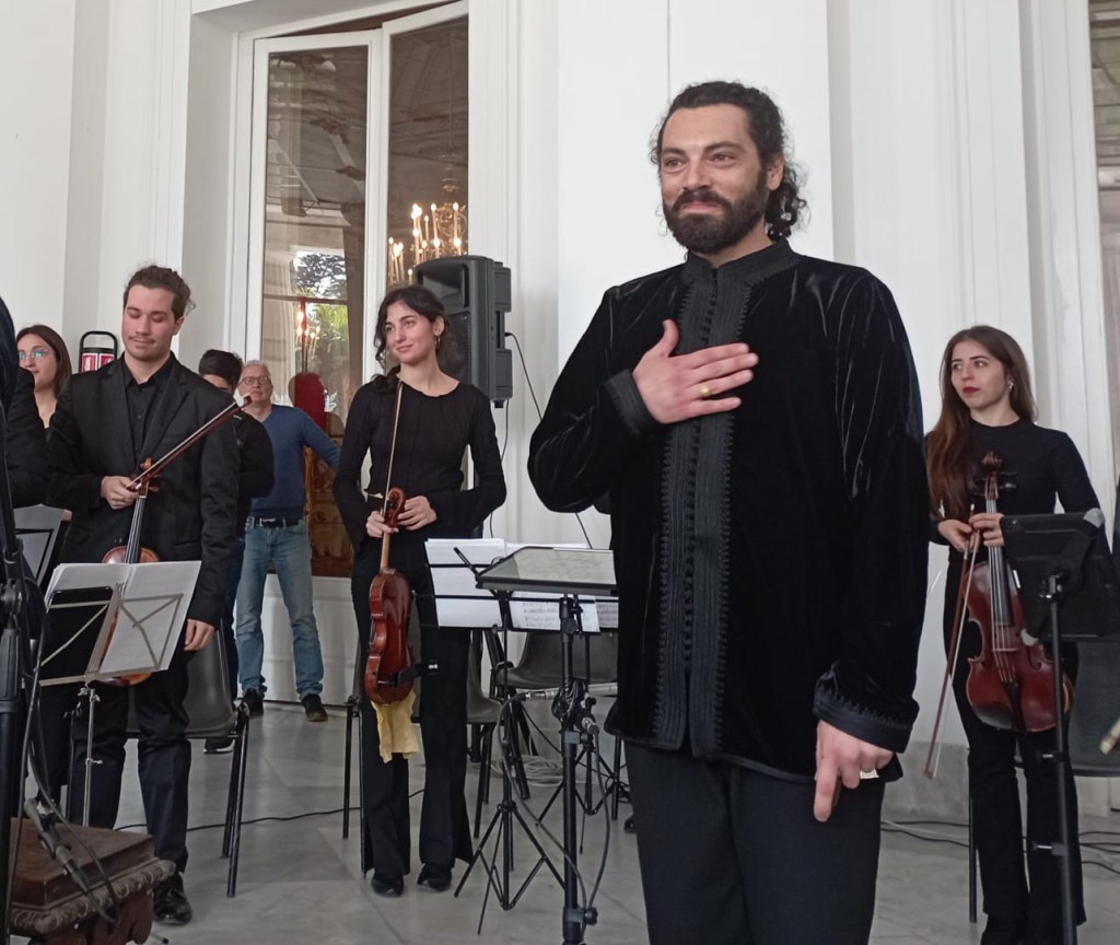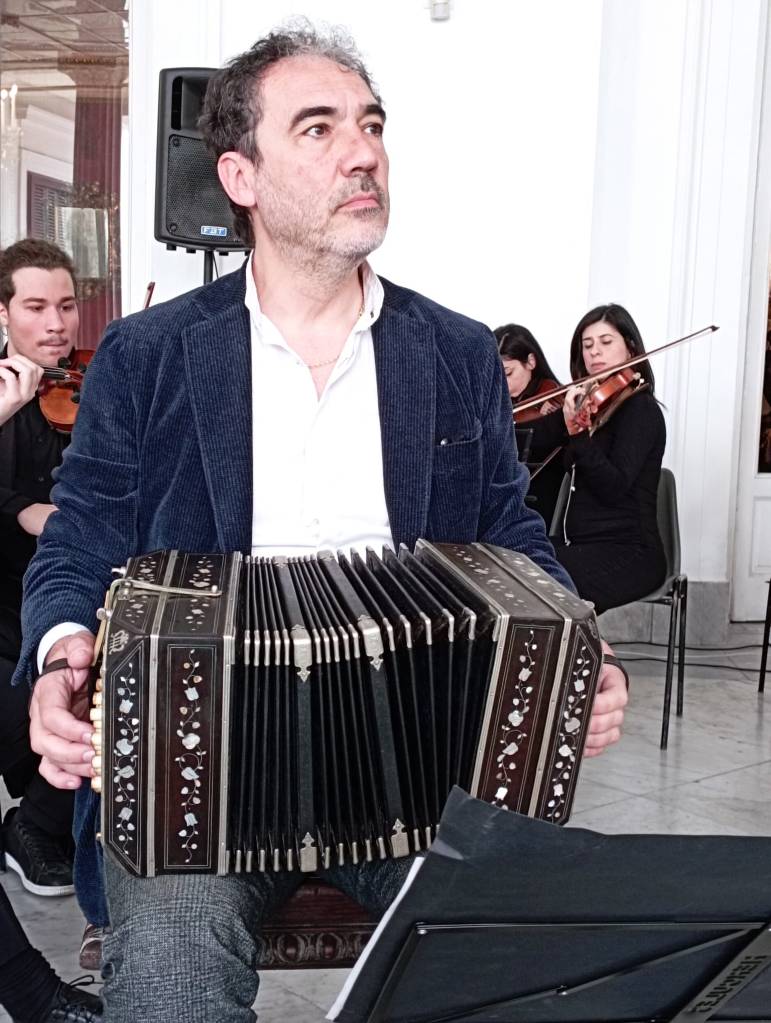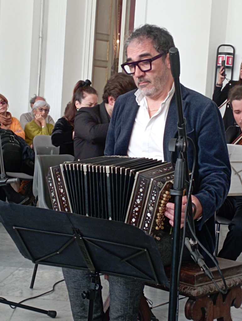 Dopo l’esibizione di alcuni allievi di canto di Emilia Zamuner del Conservatorio di Salerno, è iniziato il concerto di Daniele di Bonaventura. Il bandoneonista, nato a Fermo nelle Marche, è un compositore, arrangiatore, pianista che ha coltivato sin dall’inizio della sua attività un forte interesse per la musica improvvisata. Le sue collaborazioni spaziano dalla musica classica a quella contemporanea, dal jazz al tango. Proprio per questi motivi Daniele di Bonaventura parlando con il numeroso pubblico presente nella Villa Pignatelli dice: Vedo che non avete ricevuto il programma, il motivo è che cambio sempre la scaletta prima dell’inizio del concerto, stamattina ascolterete principalmente dei brani originali anche perché amo comporre”.