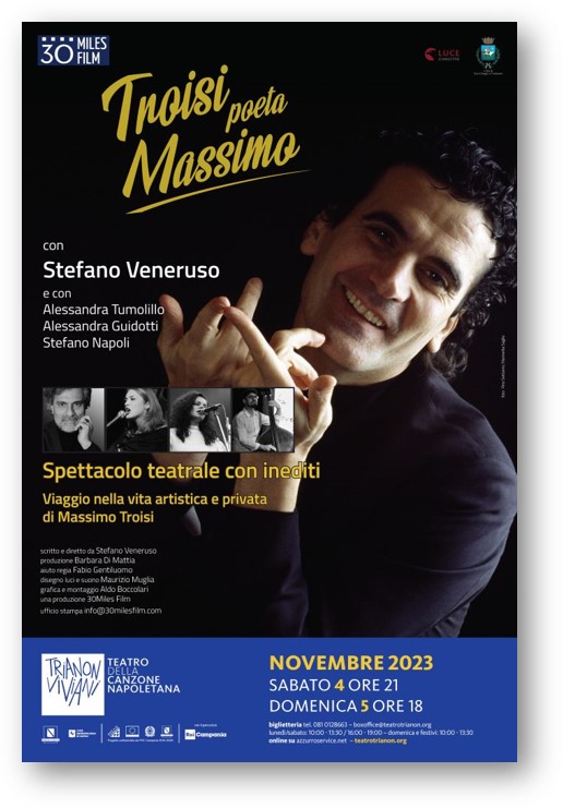 Sabato 4 novembre, alle 21, il Trianon Viviani – diretto artisticamente da Marisa Laurito, ospita “Troisi poeta Massimo”, uno «spettacolo teatrale con inediti», che è un «viaggio nella vita artistica e privata di Massimo Troisi», nel settantesimo anniversario della nascita dell’attore, regista e sceneggiatore di san Giorgio a Cremano.