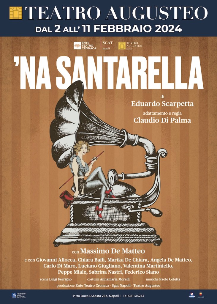 Massimo De Matteo protagonista al teatro Augusteo (Napoli, Piazzetta duca d’Aosta 263) in “‘Na santarella” di Eduardo Scarpetta, con adattamento e regia di Claudio Di Palma. Debutto nazionale venerdì 2 febbraio, in scena fino a domenica 11. Sul palco anche Giovanni Allocca, Chiara Baffi, Marika De Chiara, Angela De Matteo, Carlo Di Maro, Luciano Giugliano, Valentina Martiniello, Peppe Miale, Sabrina Nastri, Federico Siano.
