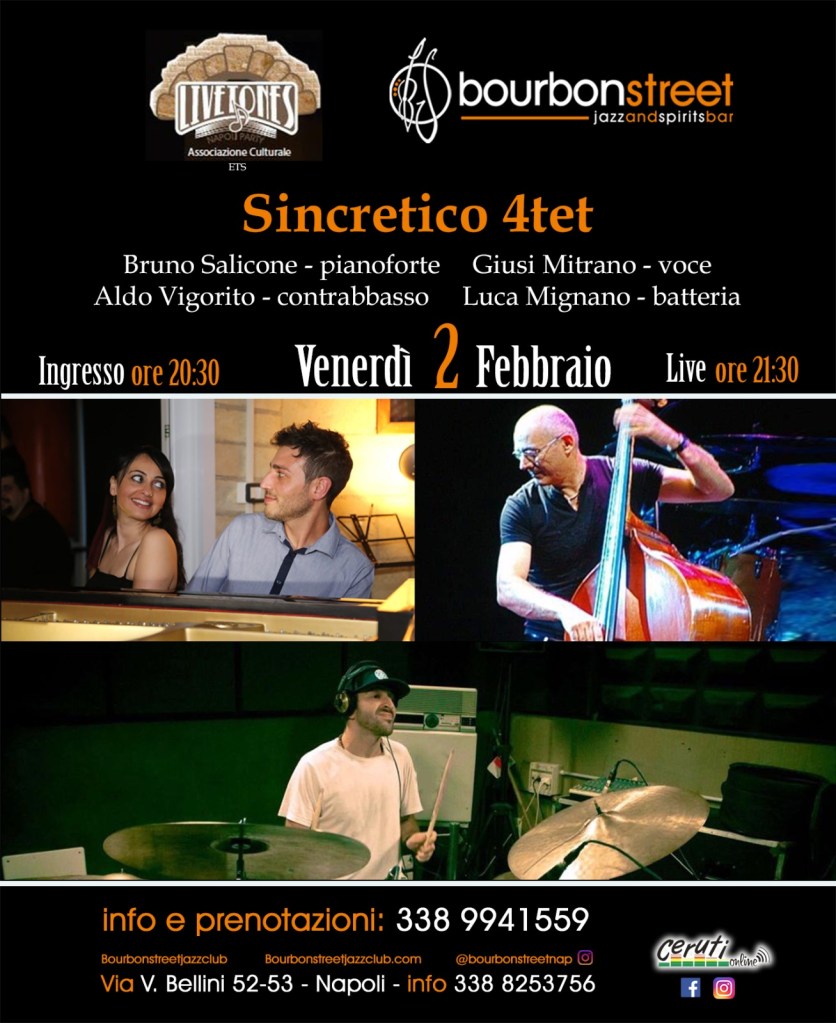 VENERDÌ 2 FEBBRAIO Il Live Tones Napoli ETS presenta sul palco del Bourbon Street Napoli Via Vincenzo Bellini 52 ore 21.45 Sincretico 4ett