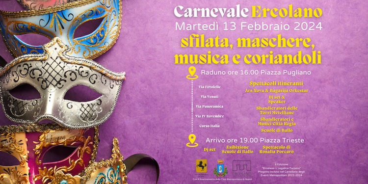 Attraverso la celebrazione del Carnevale si fronteggia l’illegalità proponendo ai più giovani messaggi positivi guardando alle tradizioni del territorio.Con il progetto “Ercolano = Legalità + Turismo”, finanziato da Città Metropolitana di Napoli, il Comune di Ercolano rilancia la festività del Carnevale, una giornata ricca di eventi spettacolari prettamente rivolta alle bambine e ai bambini che potranno passare una giornata d’incanto per le vie della loro città.[L’iniziativa è a partecipazione libera e si svolge dalle ore 16 alle ore 21]