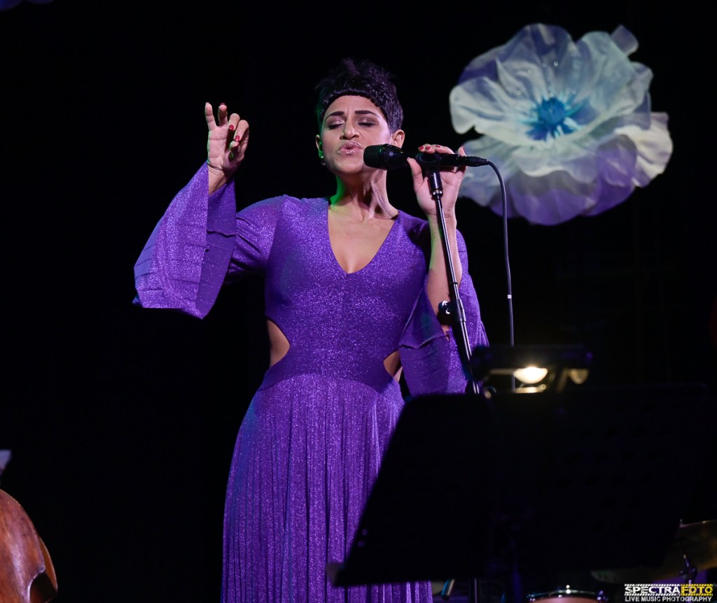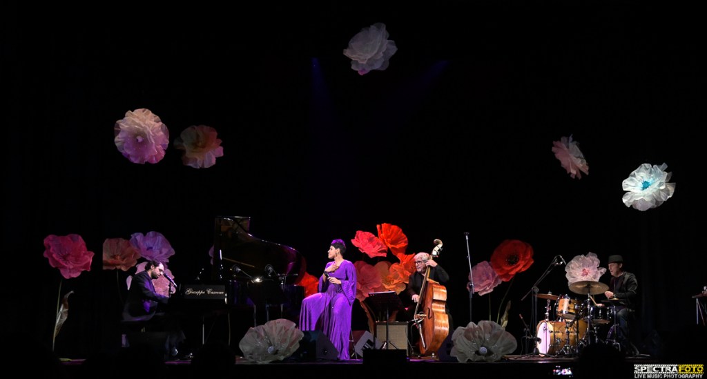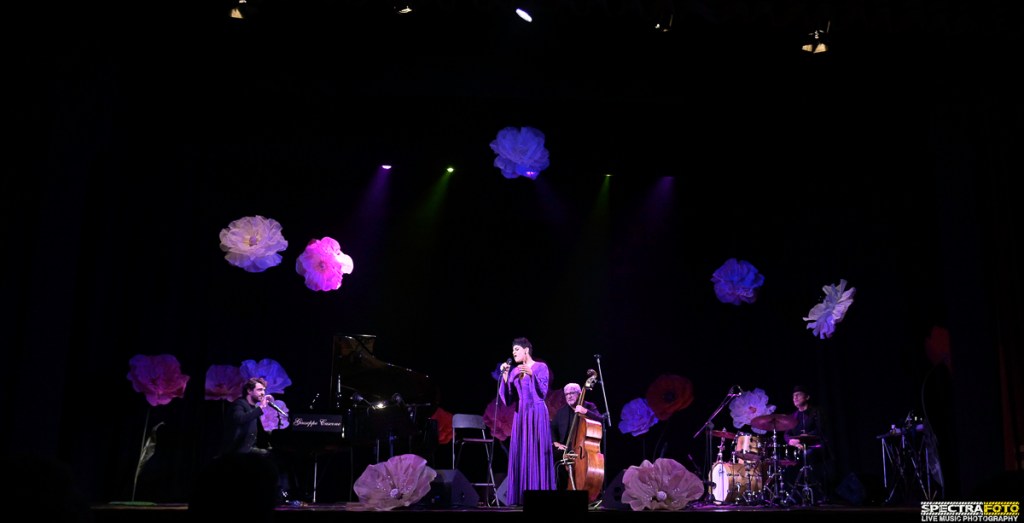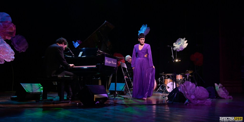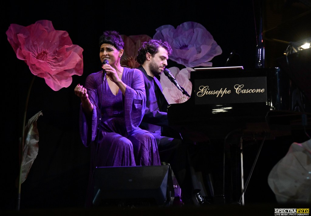 Ma il pubblico si emoziona ancora di più quando sul palco arriva Karima, bellissima ed elegantissima in un vestito lungo di colore viola (in barba alla superstizione. mai il viola in Teatro) che affascina il pubblico, interpretando con la sua straordinaria voce, due brani che hanno fatto la storia della carriera di Nat King Cole come “Unforgettable” e “Quizas Quizas Quizas “ .