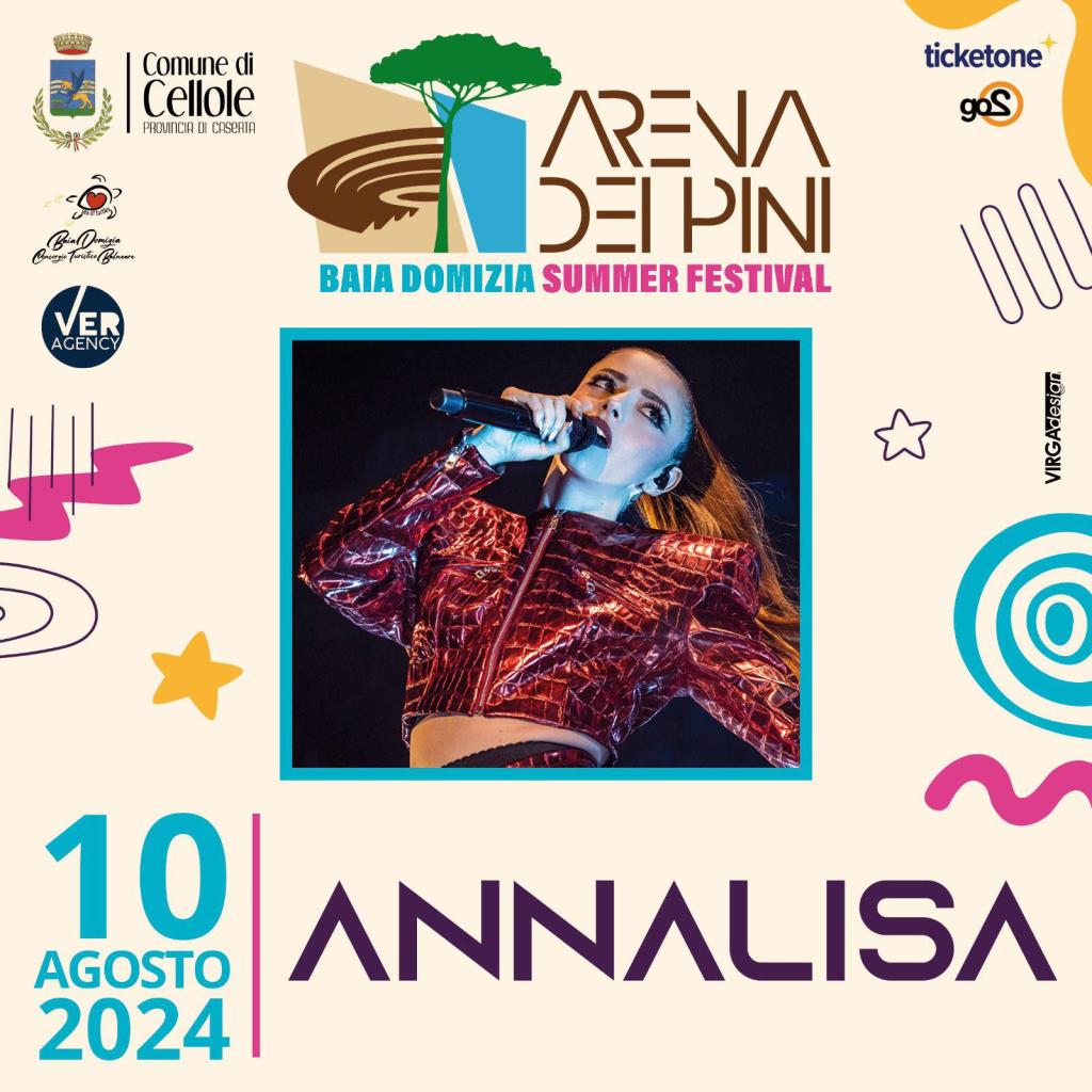 L’Arena dei Pini di Baia Domizia (Caserta) è pronta ad accogliere ANNALISA col suo “Tutti nel vortice – outdoor”. La tranche estiva del tour iniziato a metà giugno che sta facendo tappa nei principali festival italiani e che arriverà anche in Campania per un unico esclusivo concerto, sabato 10 agosto.