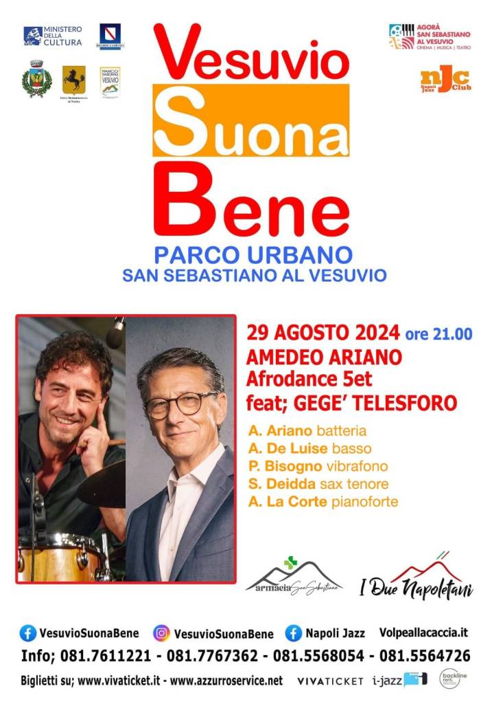 Proseguono gli eventi live al Parco Urbano di San Sebastiano al Vesuvio. Il 29 agosto protagonista della rassegna VesuvioSuonaBene sarà Amedeo Ariano, salernitano, classe 1967, eclettico batterista e percussionista di fama internazionale che sarà raggiunto sul palco da una guest d’eccezione: Gegè Telesfoto. Amedeo Ariano presenterà dal vivo il suo terzo lavoro discografico dal titolo Afrodance (prodotto dallaGrooveMaster Edition)accompagnato da Sandro Deidda al sax tenore, Antono De Luise al basso, Pierpaolo Bisogno al vibrafono e da Alessandro La Corte al pianoforte. A loro si aggiungerà per l’occasione il vocalist e performer Gegè Telesforo.