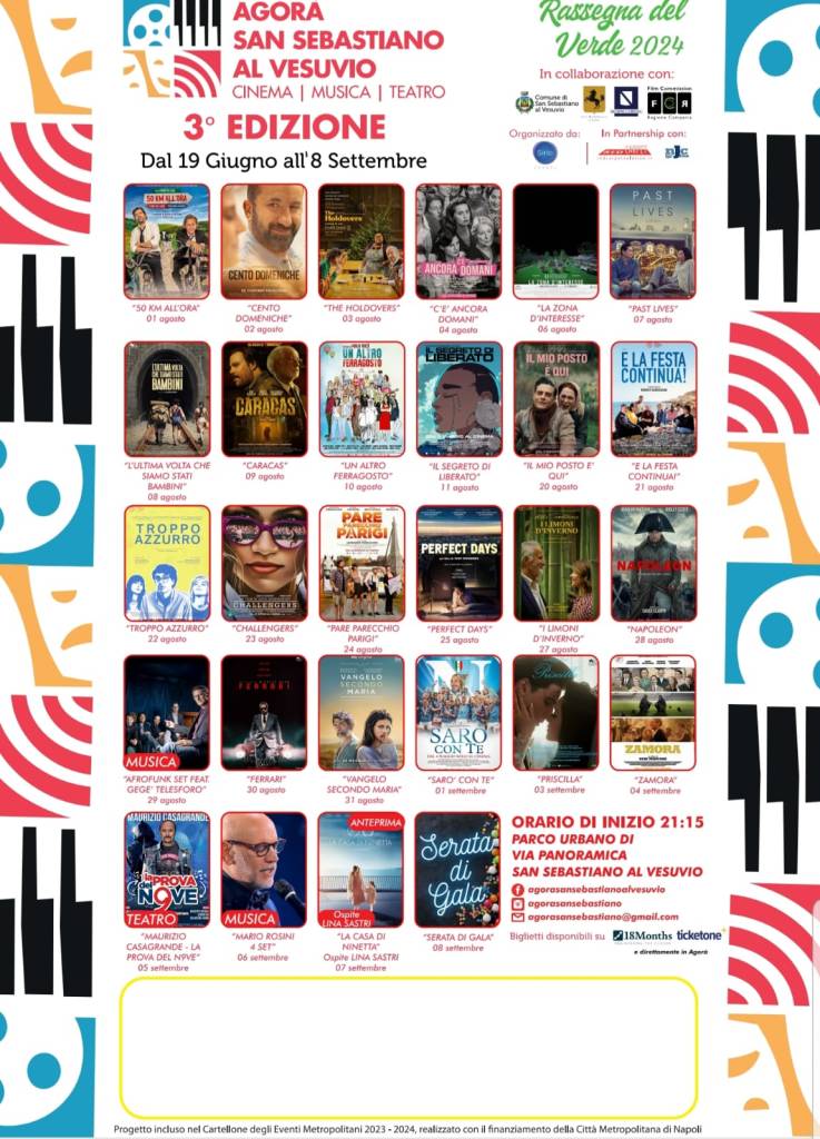 Agorà San Sebastiano al Vesuvio, nell’ambito della Rassegna del Verde 2024, gode del sostegno del Comune di San Sebastiano al Vesuvio – Ambito 28, Città Metropolitana di Napoli, Regione Campania e Film Commission e proporrà, fino all’8 settembre 2024, film, spettacoli e concerti.