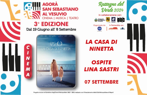 Si avvicina la conclusione e anche l’arrivo dei super ospiti ad Agorà San Sebastiano al Vesuvio terza edizione, la rassegna organizzata da Sirioevents in collaborazione con Red Carpet e Napoli Jazz Club, nell’arena di 500 posti del Parco Urbano di via Panoramica Fellapane: domani, sabato 7 settembre 2024, alle ore 21,15, Lina Sastri sarà ospite, in occasione della sua prima volta da regista, per la proiezione del film “La casa di Ninetta” (costo biglietto cinema: 3,50 euro acquistabili sulla piattaforma 18Mounth o al botteghino).