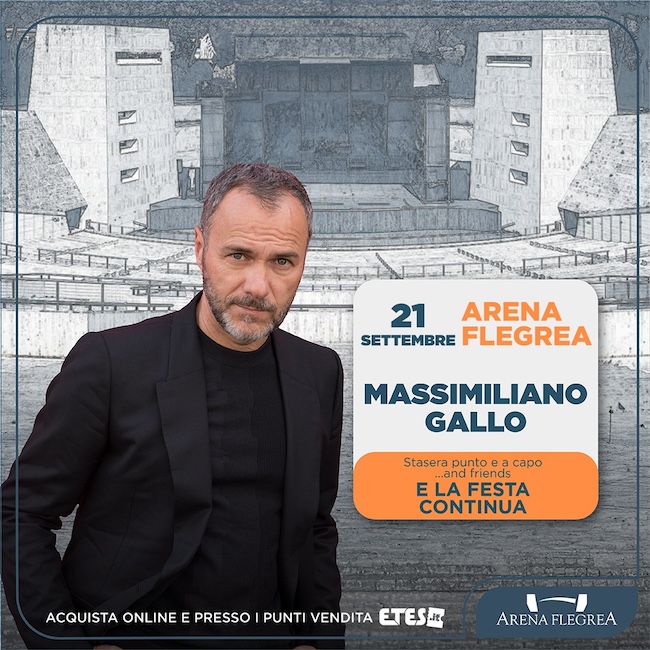 Figli di una stella”, opera prima da regista dell’attore napoletano. Nel cast Maurizio Casagrande, Gianfelice Imparato e Mariano Rigillo.Il poliedrico artista non tradisce il teatro che per l’occasione la scena sarà il prestigioso palco dell’Arena Flegrea con “Stasera punto e capo and friends e la festa continua”, una festa appunto che celebra la compagnia dell’attore che si arricchisce di amici e ospiti speciali.Sul palco, insieme a Massimiliano Gallo, ci saranno l’attrice Shalana Santana e la cantante Pina Germanà, oltre all’ensemble diretto dal maestro Mimmo Napoletano con Gianluca Mirra, Giuseppe di Colandrea, Davide Costagliola e Fabiana Sirigu.