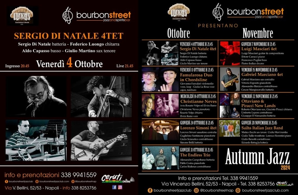 Nello storico Bourbon Street Jazz club in Via Vincenzo Bellini 52 Napoli, venerdì 4 ottobre, il Live Tones Napoli ETS dà inizio alla rassegna “Autumn Jazz” per la stagione 2024/2025 con la direzione artistica di Alberto Bruno che da svariati anni porta avanti con dedizione e passione e che si ripete per il terzo anno nell ormai ospitale location del Bourbon.