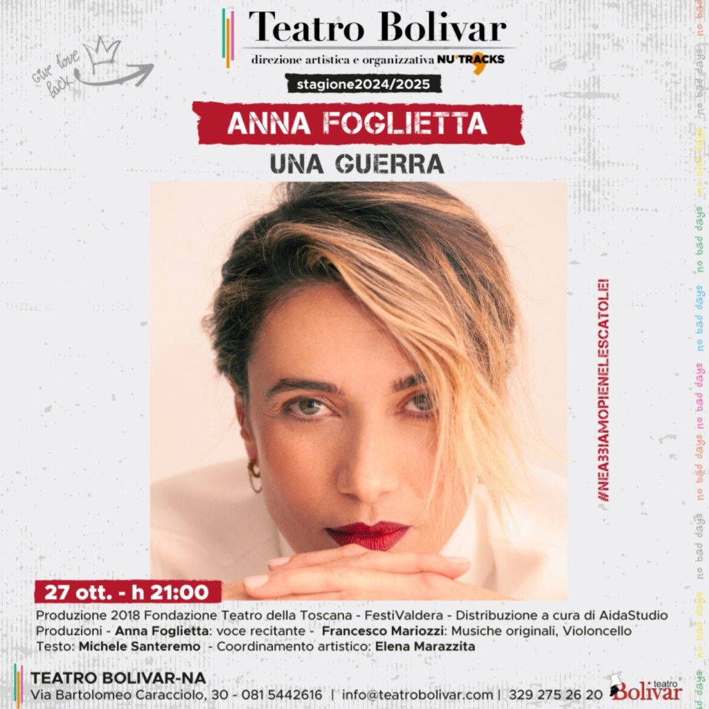 Domenica 27 ottobre 2024, alle ore 21.00, al Teatro Bolivar (Via Bartolomeo Caracciolo, 30) diretto da Nu’Tracks, arriva un altro grande appuntamento con Anna Foglietta che porterà in scena “Una guerra”.Lo spettacolo di reading racconta una storia di malessere, di presa di coscienza di quel malessere, di quella propria personale “peste”: un magnifico dipinto policromatico, denso di tensioni e brividi provenienti dalle cavità remote del mare e dalle macerie sulla terra.