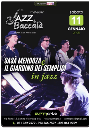 SOMMA VESUVIANA – Al Teatro Summarte ritorna la rassegna musicale JAZZ & BACCALÀ con nomi del panorama jazz internazionale e tante nuove ricette con protagonista il baccalà, ingrediente tipico della tradizione sommese, cucinato dai migliore chef locali. Jazz&Baccalà è la rassegna di Jazz del Teatro Summarte di Somma Vesuviana, giunta alla XI edizione. La rassegna adotta fin dall’inizio il format music&food, proponendo ad ogni spettacolo la degustazione di piatti della tradizione partenopea e grandissimi artisti del panorama jazz, il tutto servito da silenziosissimi e professionali camerieri, mentre le note di grandi artisti scaldano la sala, completando l’esperienza che resterà per molto tempo impressa nella memoria.