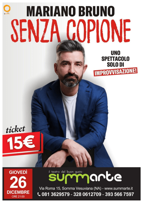 Il 26 dicembre 2024, il palco del Teatro Summarte accoglierà il grande Mariano Bruno con lo spettacolo “Senza Copione”. Il celebre comico di Made in Sud si lancerà in una serata di pura improvvisazione, offrendo al pubblico un’esperienza di comicità unica e irripetibile.