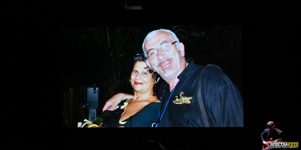 Spente le luci in sala, sul palco è entrato sul palco Mirko Gisonte , chitarrista e più volte ospite al Sorrento Jazz e molto legato a Antonino, e al suono della sua chitarra sono iniziate a scorrere foto di Antonino Esposito, ed è partito spontaneamente un lungo applauso, foto degli anni passati, Antonino insieme a Artisti, alla Moglie e al Figlio, collaboratori pezzi di vita, momenti di gioia pura sempre sorridente, in sala è calato un silenzio, momenti di grande emozione ci ha preso e tutti fissi a guardare quelle immagini sperando che da un momento all’altro Antonino uscisse sul palco a presentare la 25esima edizione a cui lui ci teneva tantissimo.