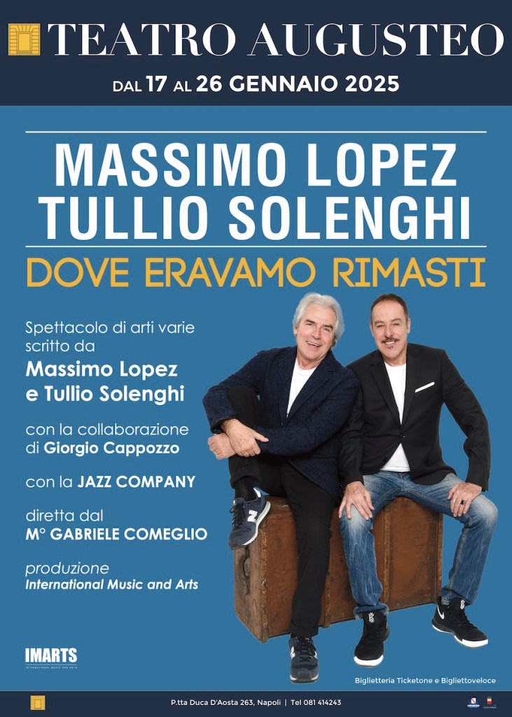 Da venerdì 17 a domenica 26 gennaio 2025, al teatro Augusteo di Napoli (Piazzetta duca d’Aosta 263), in scena Massimo Lopez e Tullio Solenghi con “Dove eravamo rimasti”, spettacolo di arti varie prodotto da International Music and Arts, scritto da Massimo Lopez e Tullio Solenghi con la collaborazione di Giorgio Cappozzo. Con la Jazz Company diretta dal M° Gabriele Comeglio.