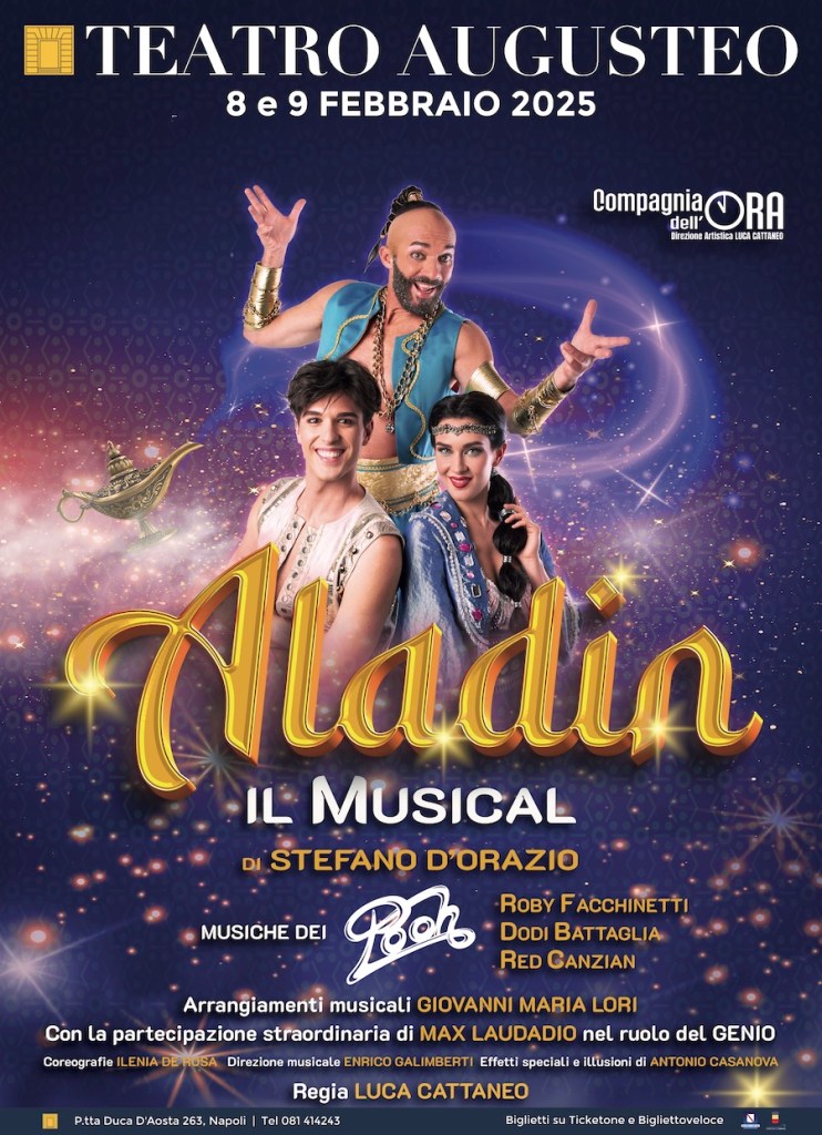 Alle ore 18 di sabato 8 e domenica 9 febbraio sarà in scena, al teatro Augusteo di Napoli (Piazzetta duca D’Aosta 263), lo spettacolo “Aladin – Il Musical” di Stefano D’Orazio, con le musiche dei Pooh (Roby Facchinetti, Dodi Battaglia, Red Canzian).