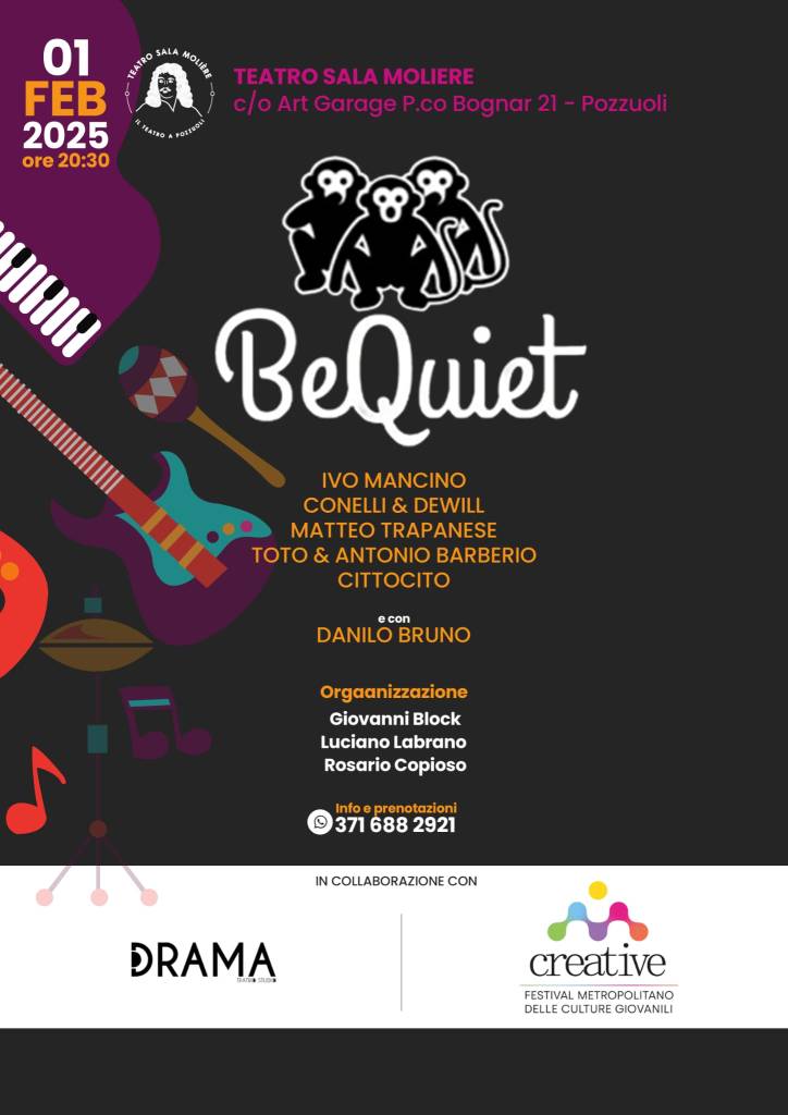 Da sabato 1° febbraio 2025, alle ore 20.30, riparte il BeQuiet di Giovanni Block, presso il Teatro Sala Molière di Pozzuoli (ArtGarage – Centro di Arti Performative in Via Bognar, 21) diretto da Nando Paone, con in scena Ivo Mancino, Conelli & Dewill, Matteo Trapanese, Toto & Antonio Barberio, Cittocito e Danilo Bruno. Coordineranno l’evento Luciano Labrano e Rosario Copioso. Il primo sabato di ogni mese, fino a maggio 2025, avranno luogo quattro serate di vera full immersion nel mondo della musica cantautorale ma, più precisamente, della musica in teatro, un luogo dove l’ascolto si fa più attento e la parola più intima e dove ogni artista avrà il suo spazio per esibirsi tra momenti dedicati alla poesia e all’ironia da cui non saranno mai esclusi gli spettatori.