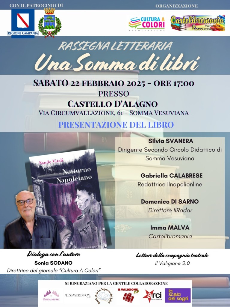 Prosegue con grande entusiasmo la rassegna letteraria organizzata da “Cartolibromania” e “Cultura a Colori” dal titolo “Una somma di libri”, che ospiterà presso il Castello d’Alagno, (in via Circumvallazione 61 a Somma Vesuviana), la presentazione del libro “Notturno Napoletano” di Nando Vitali, edito da Colonnese. L’evento, patrocinato dalla Regione Campania e dal Comune di Somma Vesuviana, si terrà sabato 22 febbraio alle ore 17:00 e si preannuncia come un’occasione imperdibile per gli appassionati di letteratura e cultura.