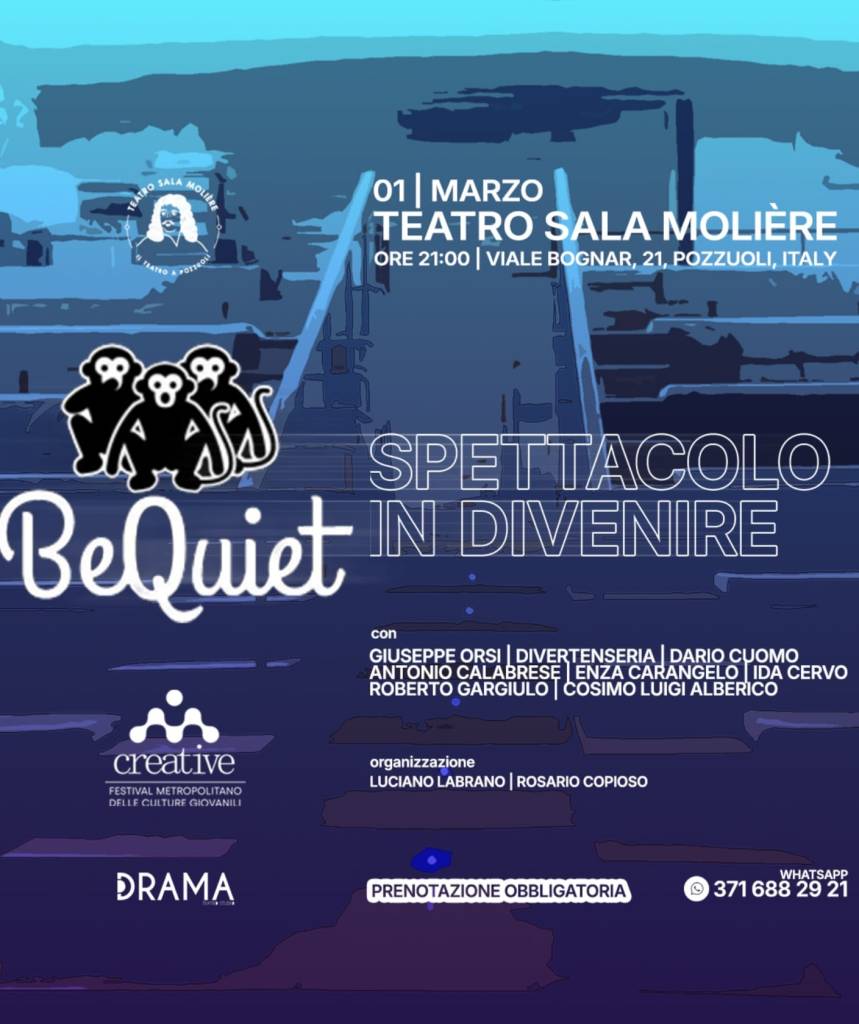 Sabato 1° marzo 2025, alle ore 20.30, torna il BeQuiet di Giovanni Block, presso il Teatro Sala Molière di Pozzuoli (ArtGarage – Centro di Arti Performative in Via Bognar, 21) diretto da Nando Paone, con in scena Giuseppe Orsi, Divertenseria, Dario Cuomo, Antonio Calabrese, Enza Carangelo, Ida Cervo, Roberto Gargiulo, Cosimo Luigi Alberico. Insieme a Giovanni Block, coordineranno l’evento Luciano Labrano e Rosario Copioso.