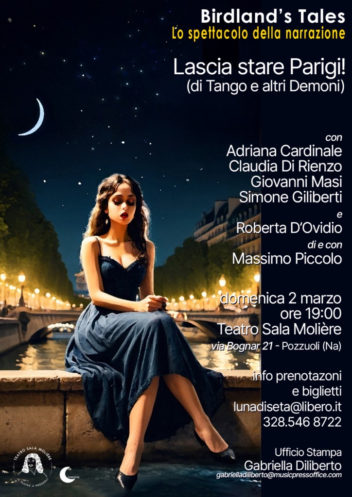 Domenica 2 marzo, alle ore 19.00, nel Teatro Sala Molière di Pozzuoli (Via Bognar, 21), diretto da Nando Paone, il format “Birdland’s Tales” di Massimo Piccolo torna a teatro con il nuovo capitolo inedito “Lascia stare Parigi – di Tango e di altri Demoni”, che questa volta prende il titolo da un racconto dello stesso autore e regista mentre il sottotitolo lascia qualche indizio su quali potranno essere i temi trattati. Organizzato dall’Associazione Luna di Seta, lo spettacolo di narrazione vedrà in scena con Piccolo, Masi e Giliberti (chitarra e violino), a cui è stata affidata la parte musicale, Claudia Di Rienzo (altra voce narrante), Adriana Cardinale (voce cantante) e Roberta D’Ovidio (altra voce narrante).