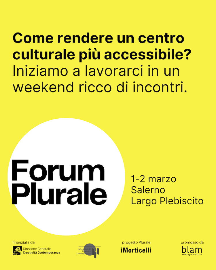 Salerno, 25 febbraio 2025 – Accessibilità non è solo una questione di barriere architettoniche, ma di linguaggi, rappresentazioni, possibilità di partecipazione. Con questo spirito nasce Forum Plurale, l’evento di apertura di “Plurale – i Morticelli, uno spazio per tuttə!”, il nuovo progetto di cui BLAM è capofila, vincitore del bando Laboratorio Creatività Contemporanea promosso dalla Direzione Generale Creatività Contemporanea del MiC nell’ambito dell’avviso pubblico “Laboratorio di Creatività Contemporanea” – 6a edizione 2024-2026, che coinvolge la programmazione del centro culturale iMorticelli a Salerno, in Largo Plebiscito.