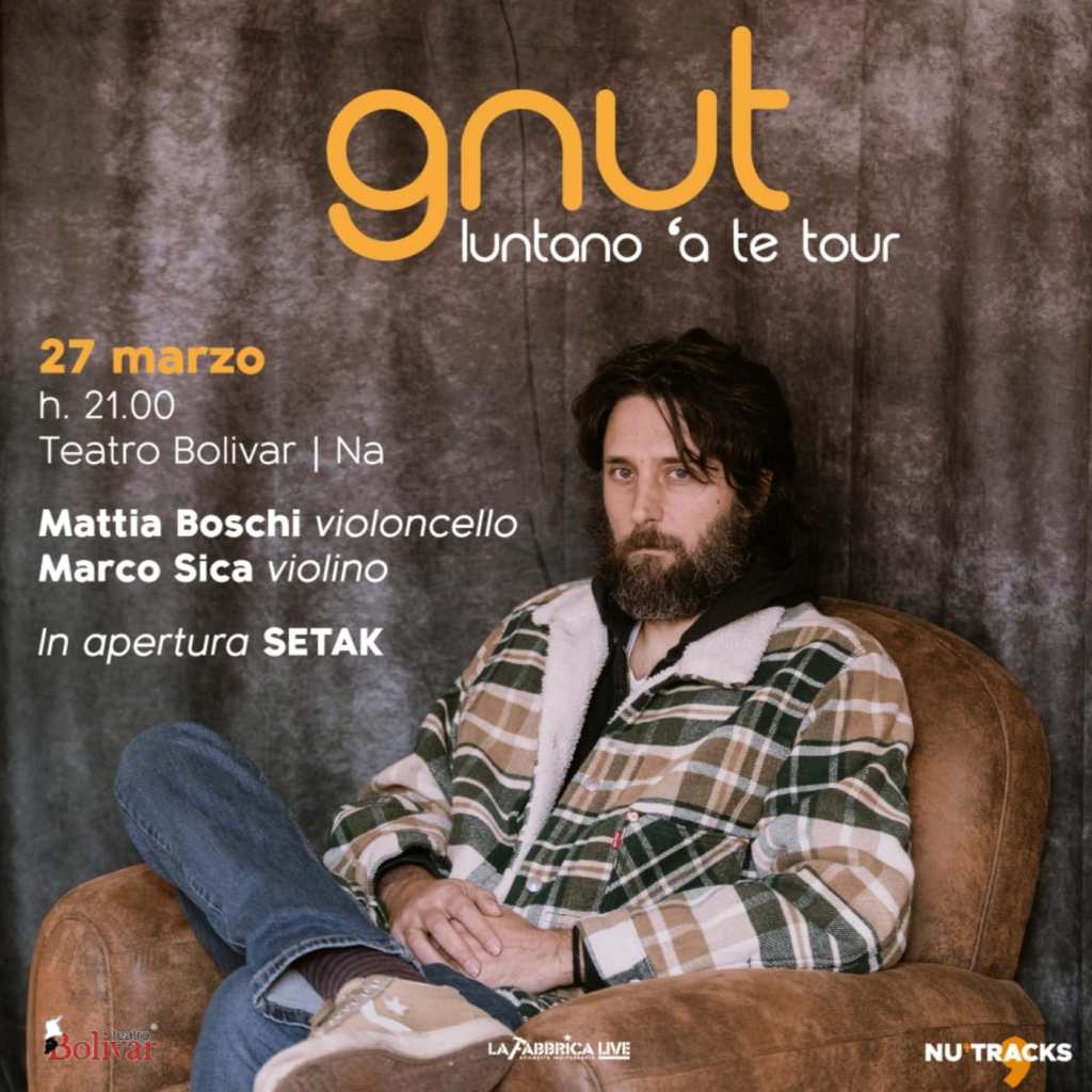 Giovedì 27 marzo, alle ore 21.00, Gnut torna a Napoli, al Teatro Bolivar (Via Bartolomeo Caracciolo, 30), diretto da Nu’Tracks, con il live “Luntano ‘a te Tour”, il nuovo tour di Gnut, iniziato questo mese e che lo vedrà calcare i palchi dei club della nostra penisolain trio con Mattia Boschi al violoncello e Marco Sica al violino. Il concerto sarà anticipato dall’open act di Setak.