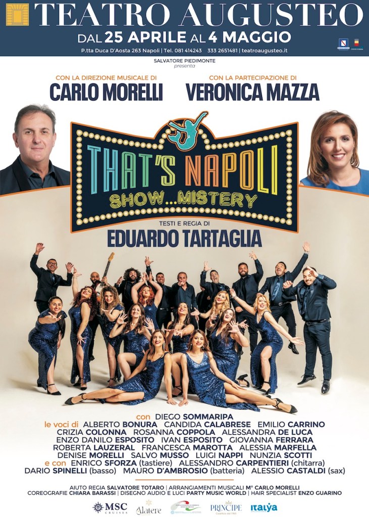Il palcoscenico del teatro Augusteo (Napoli, Piazzetta duca d’Aosta 263) si riempie di note, melodie, voci e canzoni che prendono vita nel “That’s Napoli Show …Mistery”, in scena da venerdì 25 aprile a domenica 4 maggio.