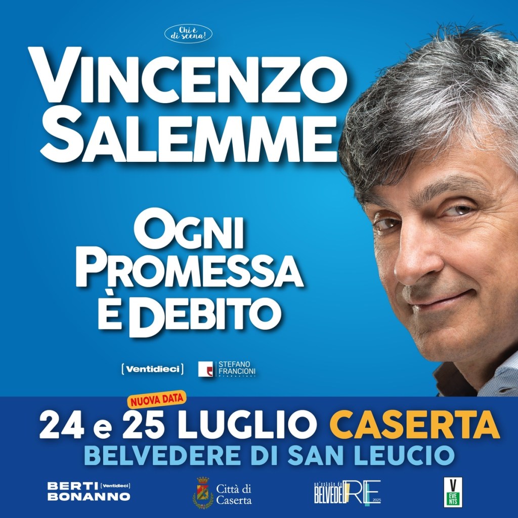 A Grande richiesta, Vincenzo Salemme raddoppia le date del suo nuovo spettacolo a Caserta, per il festival Un’Estate da Belvedere. Il drammaturgo, regista e attore napoletano porterà in scena “Ogni promessa è debito”, il 24 e 25 luglio al Belvedere di San Leucio, nell’ambito della decima edizione del festival prodotto e organizzato da Lwr S.r.l. di Massimo Vecchione, con la supervisione artistica di Vincenzo Berti e Gianluca Bonanno per Ventidieci e il patrocinio del Comune di Caserta.