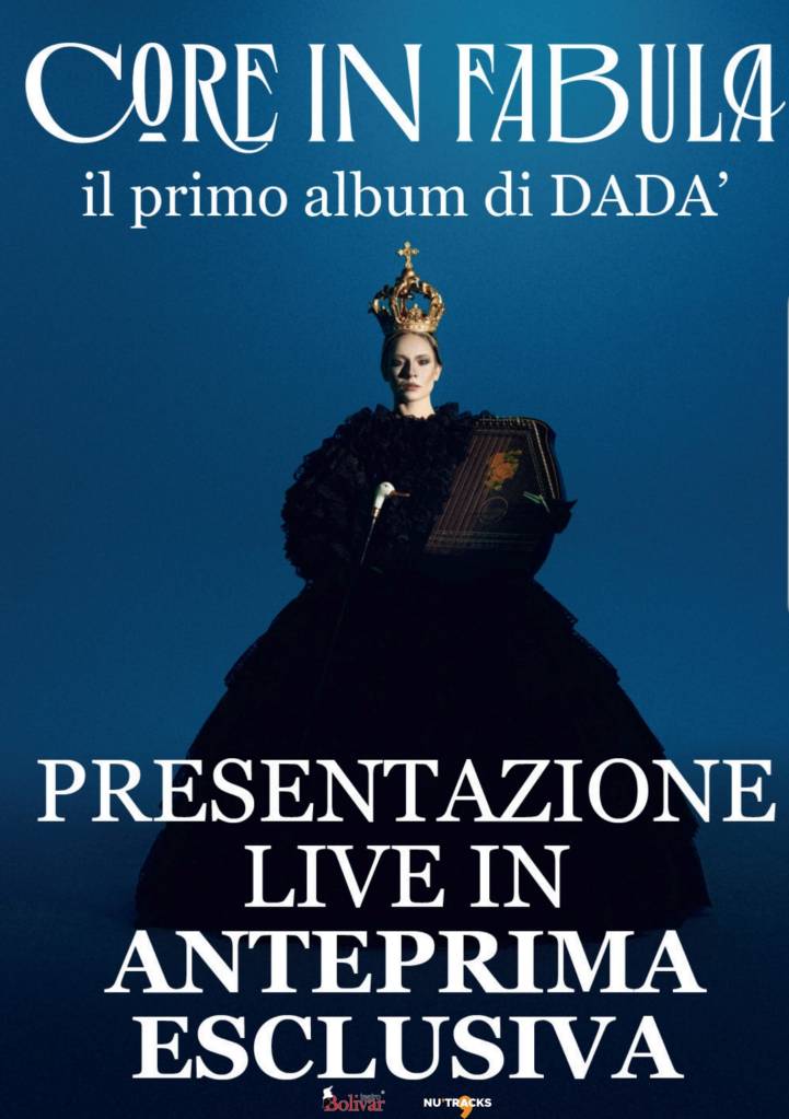 Giovedì 22 maggio, alle ore 21.00, sul palco del Teatro Bolivar, diretto da Nu’Tracks, Dadà presenta in anteprima esclusiva live il suo primo album “Core in Fabula”, in uscita il giorno successivo. “Core in fabula” è un concept album profondo e fantasioso che verrà messo in scena coinvolgendo moda, musica, teatro, improvvisazione e design a 360 gradi. Una performance totalmente inedita, con ospiti e interventi tanto particolari quanto lo è il mondo magico e popolare della fiaba.