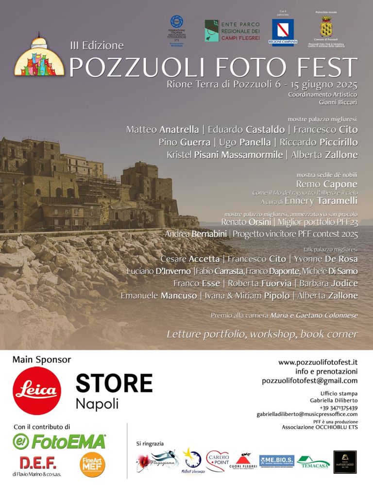 Pozzuoli torna a essere capitale della fotografia con la nuova edizione del Pozzuoli Foto Fest, diretto da Gianni Biccari, in programma da venerdì 6 al 15 giugno 2025 nella splendida cornice del Rione Terra di Pozzuoli (Palazzo Migliaresi, Sedile de’ Nobili e Sala Conferenze). Il festival sarà ricco di mostre, incontri, letture portfolio, talk e workshop che animeranno i luoghi storici del borgo flegreo e riunirà fotografi affermati, nuove voci dell’immagine contemporanea e un pubblico sempre più partecipe e appassionato. Il tema di quest’anno, orientato ad autori e storie dei Sud del mondo, guarda al potere della fotografia di raccontare, interrogare, trasformare. Un’occasione per riflettere insieme sul valore dell’immagine come strumento di consapevolezza, racconto e connessione con il presente.
