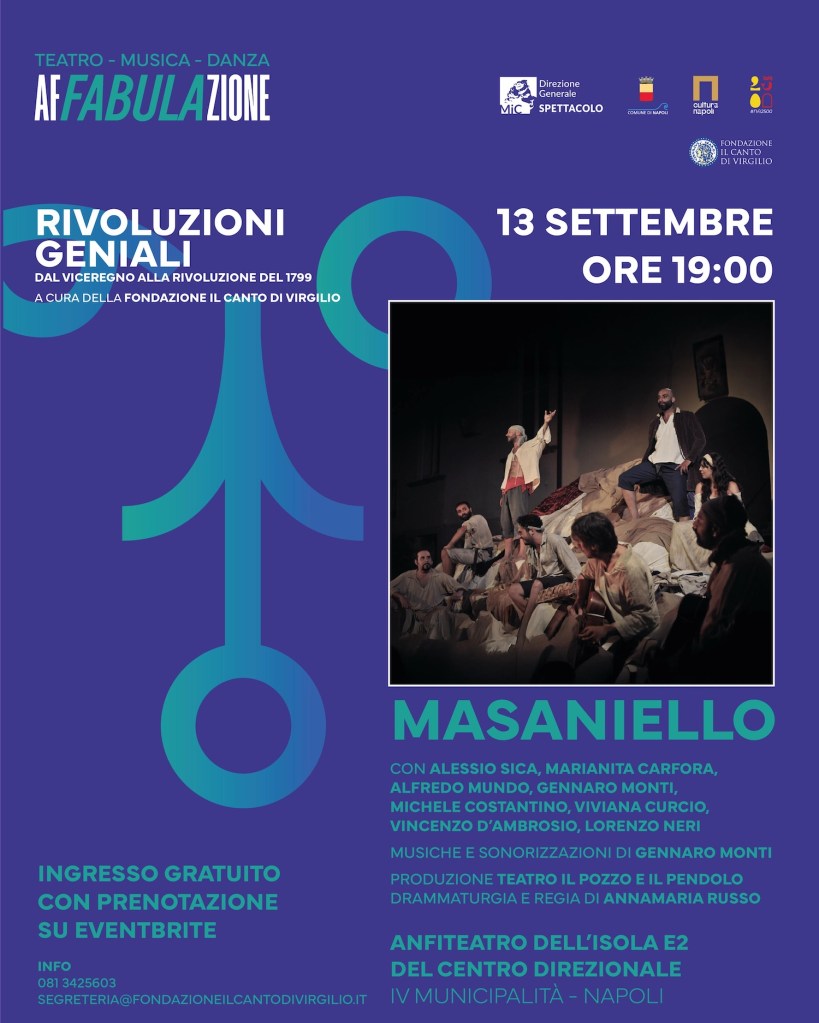 La narrazione prosegue sabato 13 settembre (inizio ore 19:00 presso l’Anfiteatro dell’Isola E2 del Centro Direzionale) con la folgorante messinscena di “Masaniello”, a cura del Teatro Il Pozzo e il Pendolo, che rievoca la rivoluzione del 1647 guidata da Tommaso Aniello d’Amalfi, meglio noto come Masaniello. È il racconto di un sogno popolare: come nasce, splende e muore nelle tenebre della disillusione, in un dramma senza lieto fine. Drammaturgia e regia di Annamaria Russo. Con Alessio Sica, Marianita Carfora, Alfredo Mundo, Michele Costantino, Viviana Curcio, Vincenzo D’Ambrosio, Lorenzo Neri. Musiche e sonorizzazioni di Gennaro Monti.