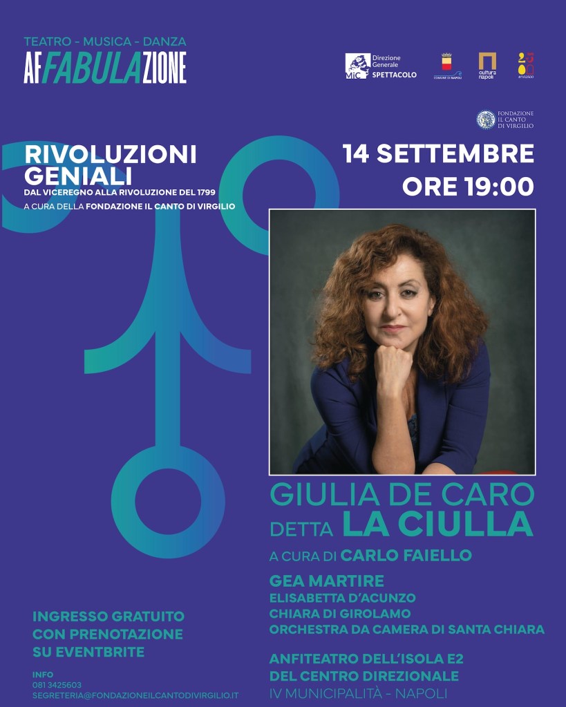 Domenica 14 settembre (inizio ore 19:00 presso l’Anfiteatro dell’Isola E2 del Centro Direzionale) è la volta della rappresentazione di “Giulia De Caro, detta ‘la Ciulla’”, che ripercorre le vicende di una figura straordinaria del Seicento napoletano, conosciuta per il suo spirito libero e per il ruolo di diva, cantante, impresaria e donna d’affari: una storia simbolo di anticonformismo e intraprendenza. L’opera è scritta e diretta da Carlo Faiello. Con Gea Martire, Elisabetta D’Acunzo e Chiara Di Girolamo. E con l’Orchestra da Camera di Santa Chiara.