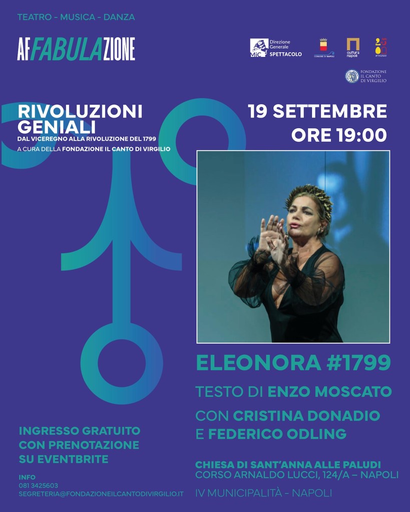 La protagonista del terzo week end di settembre è Eleonora de Fonseca Pimentel, anche cuore storico ed emotivo della rassegna. Per venerdì 19 settembre (inizio ore 19:00 presso la Chiesa di Sant’Anna alle Paludi, in corso Arnaldo Lucci) è previsto con “Eleonora #1799” un omaggio alla figura chiave della Repubblica Napoletana del 1799: una performance di rara finezza, con le parole del testo concepito dal drammaturgo Enzo Moscato e interpretato dall’attrice Cristina Donadio, mentre la colonna sonora è firmata dal violoncellista Federico Odling.