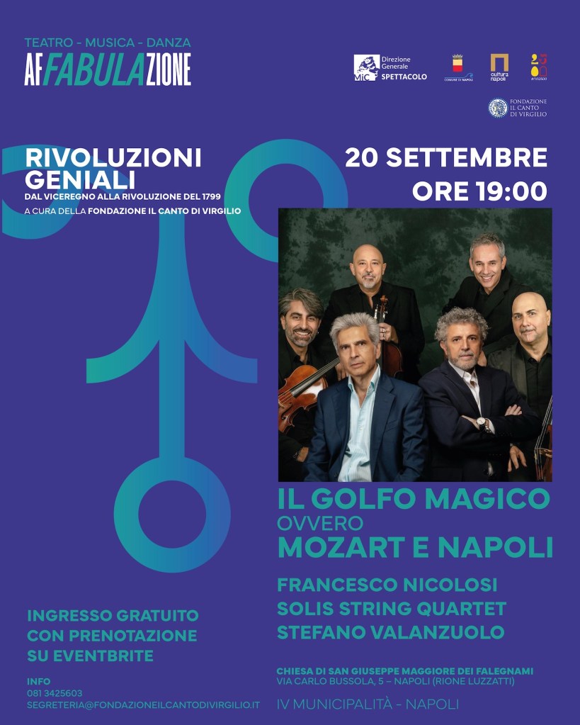 A concludere la rassegna, sabato 20 settembre (inizio ore 19:00 presso la Chiesa di San Giuseppe Maggiore dei Falegnami, in via Carlo Bussola), è “Il golfo magico, ovvero Mozart e Napoli”, il racconto del viaggio fatto nel 1770 dal compositore austriaco all’ombra del Vesuvio, affidato alla voce narrante di Stefano Valanzuolo e alla performance del Solis String Quartet e di Francesco Nicolosi al pianoforte. La musica di Mozart, intrisa di fantasia e in continua ebollizione, viene messa in relazione con l’energia creativa e vulcanica della città che lo ospitò.