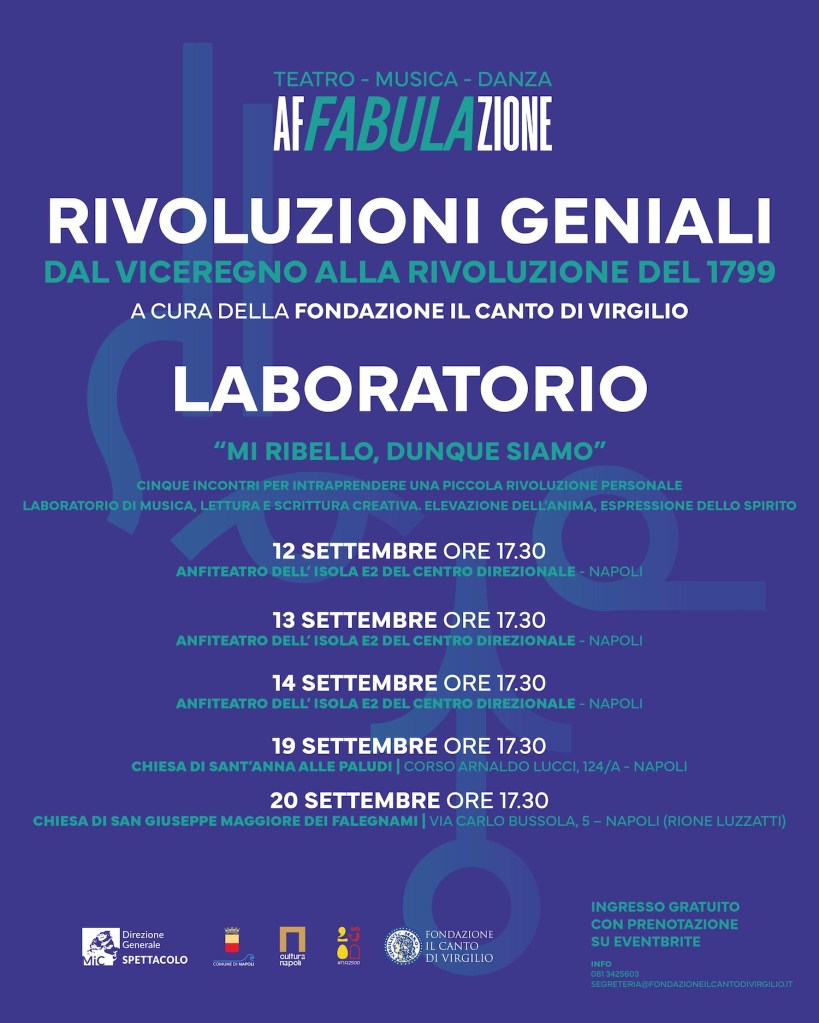 “Rivoluzioni geniali”, organizzata dalla Fondazione Il Canto di Virgilio sotto la direzione artistica di Carlo Faiello, arriva nella Municipalità 4 (quartiere di Poggioreale e Zona Industriale) per esplorare, attraverso un ricco programma di spettacoli, incontri e laboratori, uno dei periodi più tumultuosi e creativi della storia partenopea: dal Viceregno spagnolo alla Rivoluzione del 1799. La rassegna si svolge in due intensi weekend: 12, 13 e 14 settembre e 19 e 20 settembre, con 5 spettacoli dal vivo a ingresso libero con prenotazione obbligatoria sulla piattaforma Eventbrite.