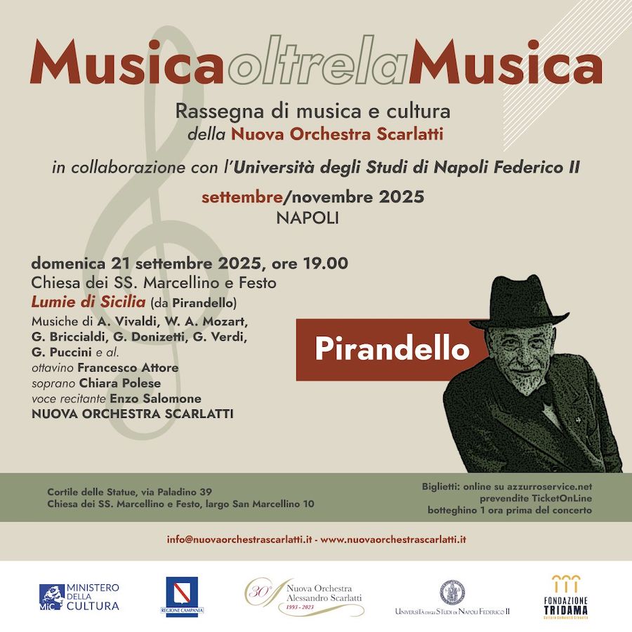 Domenica 21 settembre 2025 alle ore 19, nella Chiesa dei SS. Marcellino e Festo, a Napoli in Largo San Marcellino 10, appuntamento con “Lumie di Sicilia”, originale reading poetico-musicale intorno all’omonima novella di Luigi Pirandello. Terzo appuntamento della rassegna MusicaoltrelaMusica, realizzata dalla N.O.S. in partnership con l’Università degli Studi di Napoli ‘Federico II’.