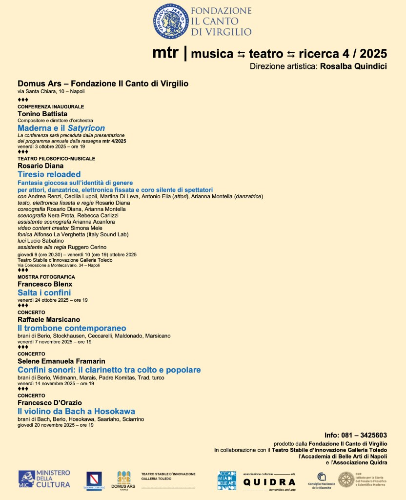 “Con Mtr la Fondazione Il Canto di Virgilio rinnova il suo impegno nel creare un ponte tra la ricerca umanistica e la scena artistica, offrendo al pubblico occasioni di incontro tra pensiero e creatività. Crediamo che solo favorendo la complicità tra ricerca e arti performative si possano generare nuove forme di bellezza e di conoscenza dacondividere con la comunità.” Carlo Maria Faiello, Presidente della Fondazione Il Canto di Virgilio