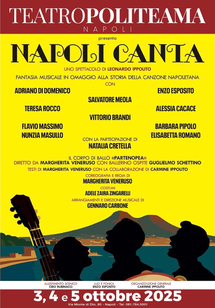 Debutta al Politeama di Napoli, in Via Monte di Dio 80, in scena da venerdì 3 a domenica 5 ottobre 2025, “Napoli Canta”, il nuovo spettacolo di Leonardo Ippolito. Ideato per celebrare e valorizzare l’immenso patrimonio della canzone classica napoletana, espressione artistica e culturale tra le più significative e riconosciute a livello internazionale, lo spettacolo è in omaggio per gli abbonati alla stagione 2025//26 del teatro Augusteo.