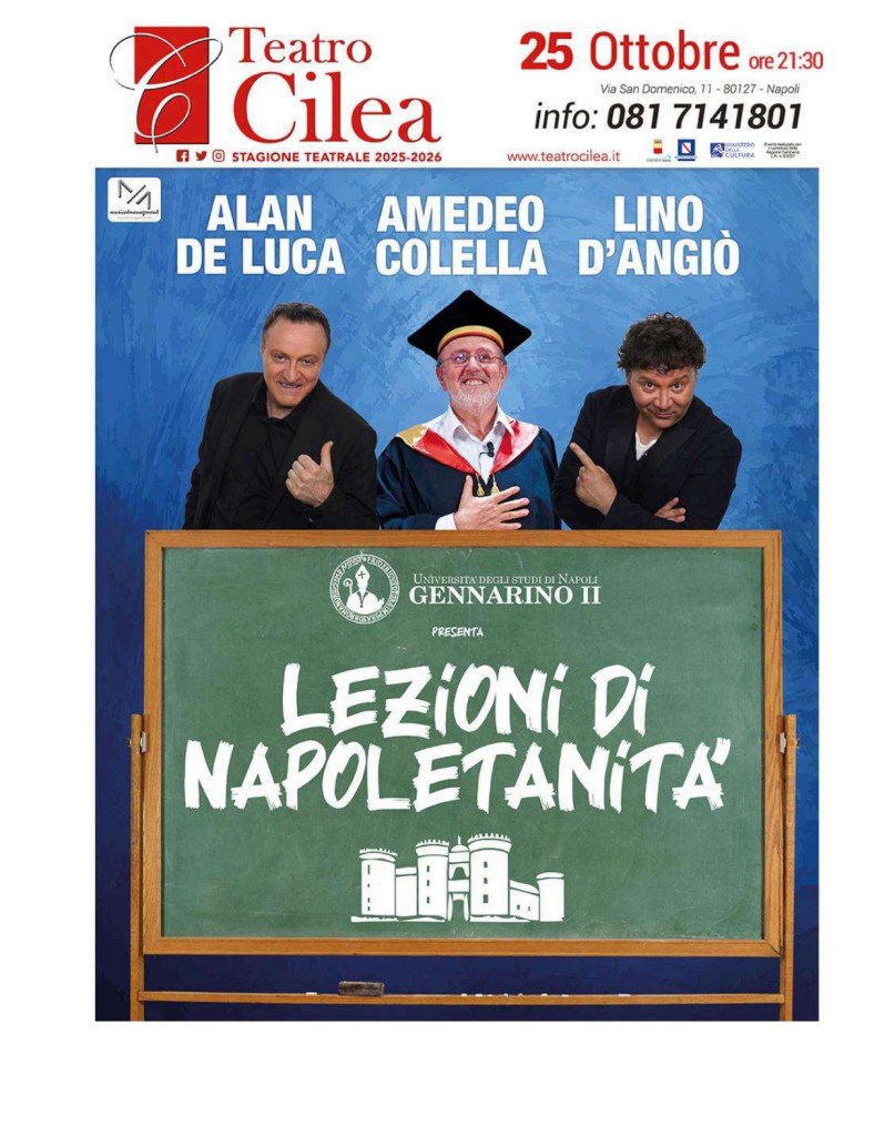 25 Ottobre (data unica): “Lezioni di Napoletanità” con Alan De Luca, Amedeo Colella, Lino D’Angiò. Un viaggio unico tra storia, musica e risate nell’ironica “Università degli Studi di Napoli Gennarino II”.