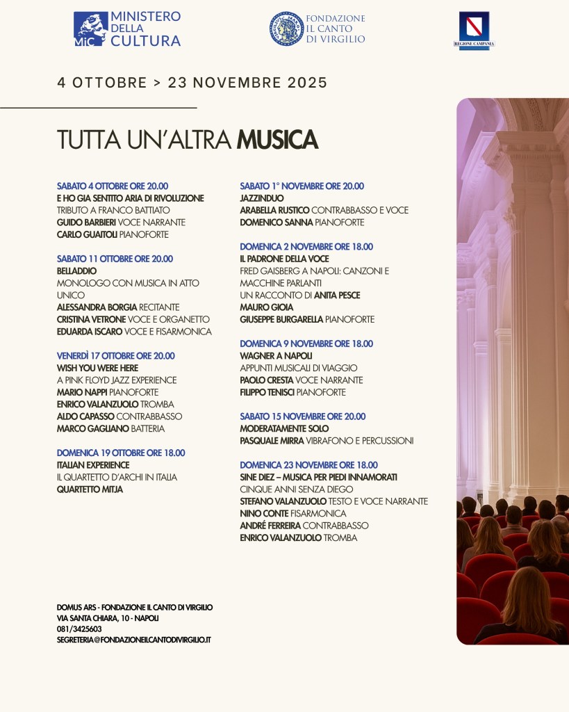 «Con Tutta un’altra Musica – dichiara Carlo Maria Faiello, presidente della Fondazione Il Canto di Virgilio – intendiamo offrire al pubblico un percorso che non si limita a proporre concerti, ma che crea connessioni tra linguaggi, memorie e nuove visioni. La musica diventa così un ponte tra tradizione e contemporaneità, tra ricerca e divulgazione, e restituisce a Napoli il ruolo di crocevia culturale e creativo».