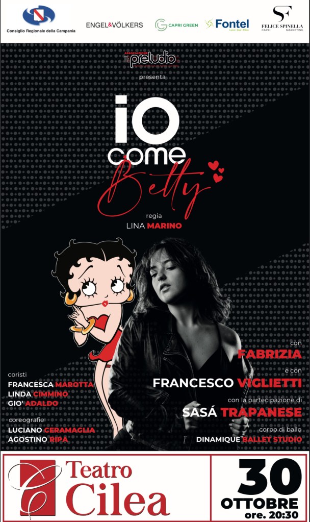 Dopo lo straordinario debutto a Capri, arriva a Napoli al teatro Cilea (unica data) il prossimo 30 ottobre lo spettacolo musicale “Io come Betty” che vedrà protagonista la giovane promettente artista Fabrizia Salvia; già vincitrice di numerosi premi in ambito musicale come “Sanremo canta Napoli” o il premio dedicato al compianto Mino Reitano che vanta partecipazioni a importanti eventi come il Cantagiro e la Settembrata Caprese. L’artista sarà accompagnata sul palco da due colossi dello spettacolo come Sasá Trapanese e Francesco Viglietti e la regia sarà firmata da Lina Marino. L’evento, in programma alle ore 20.30, con il patrocinio della Regione Campania e il supporto di Scabec, ha anche uno scopo benefico ed è dedicato all’Unitalsi per i ragazzi disabili.